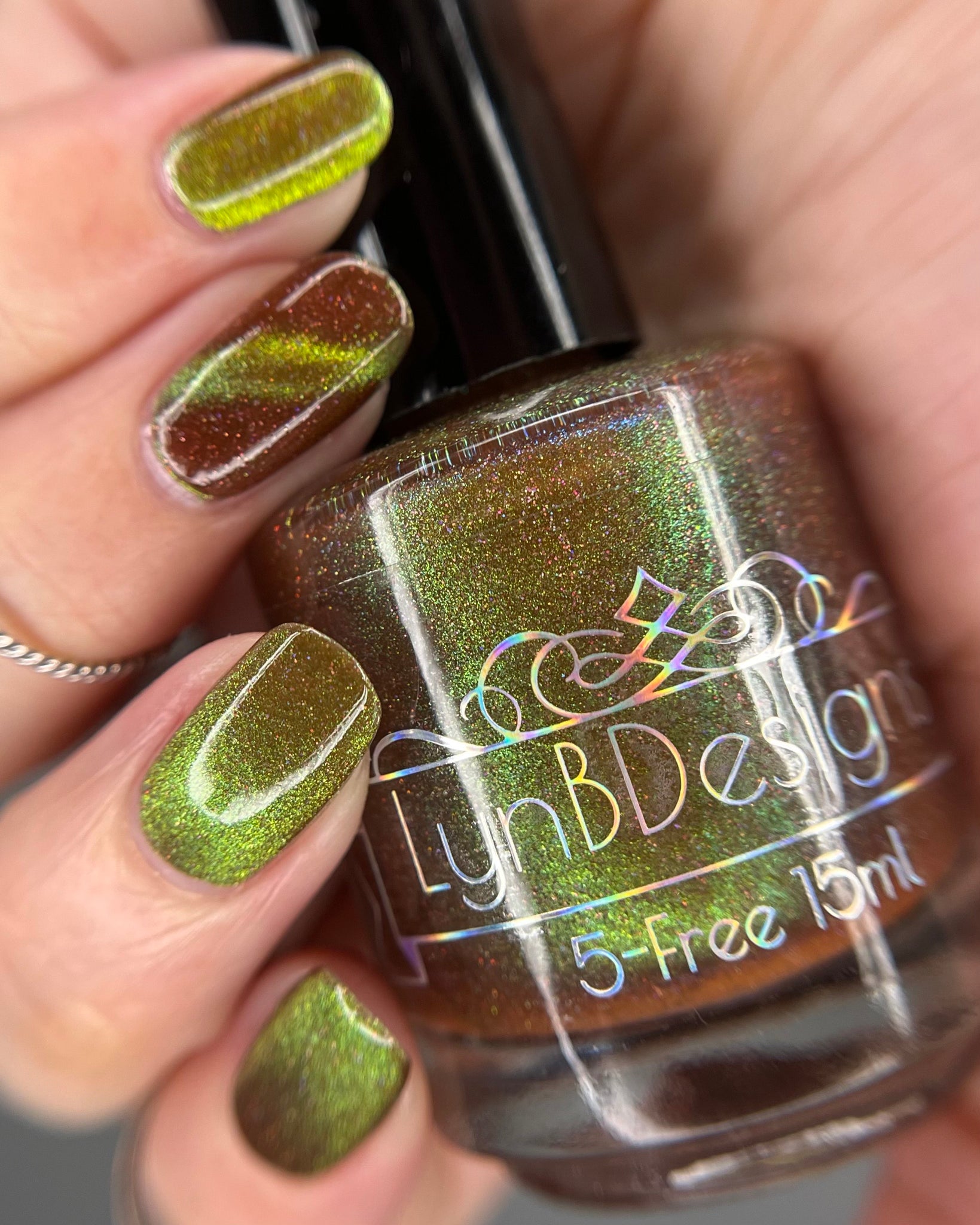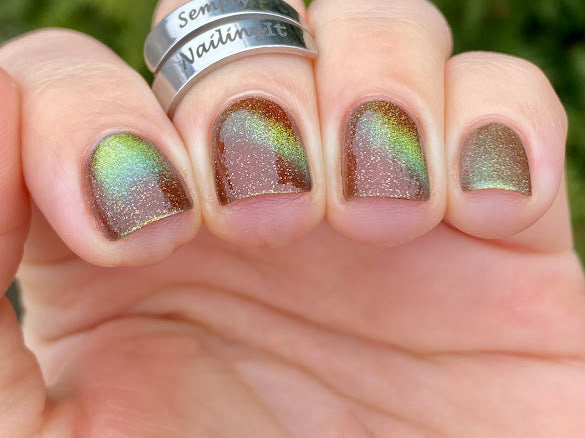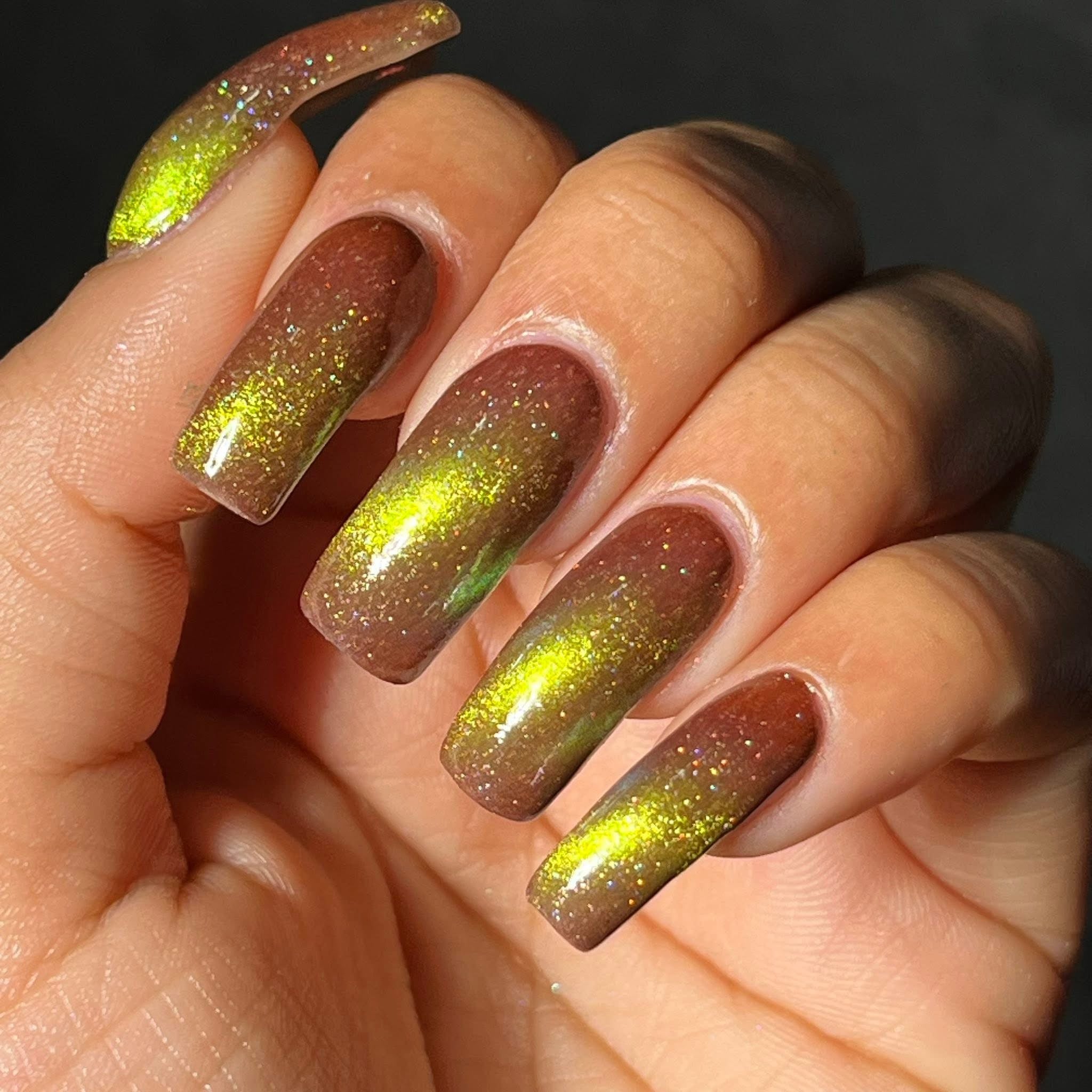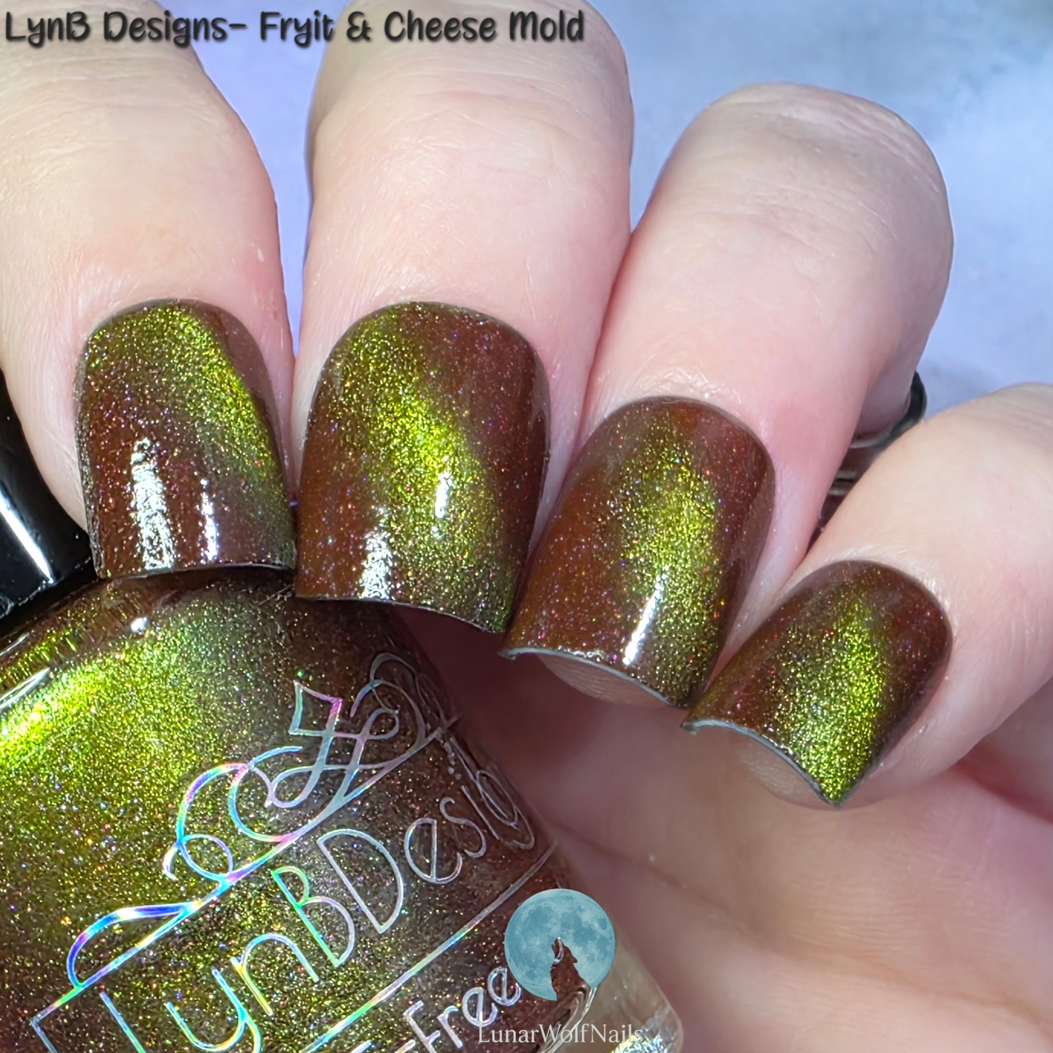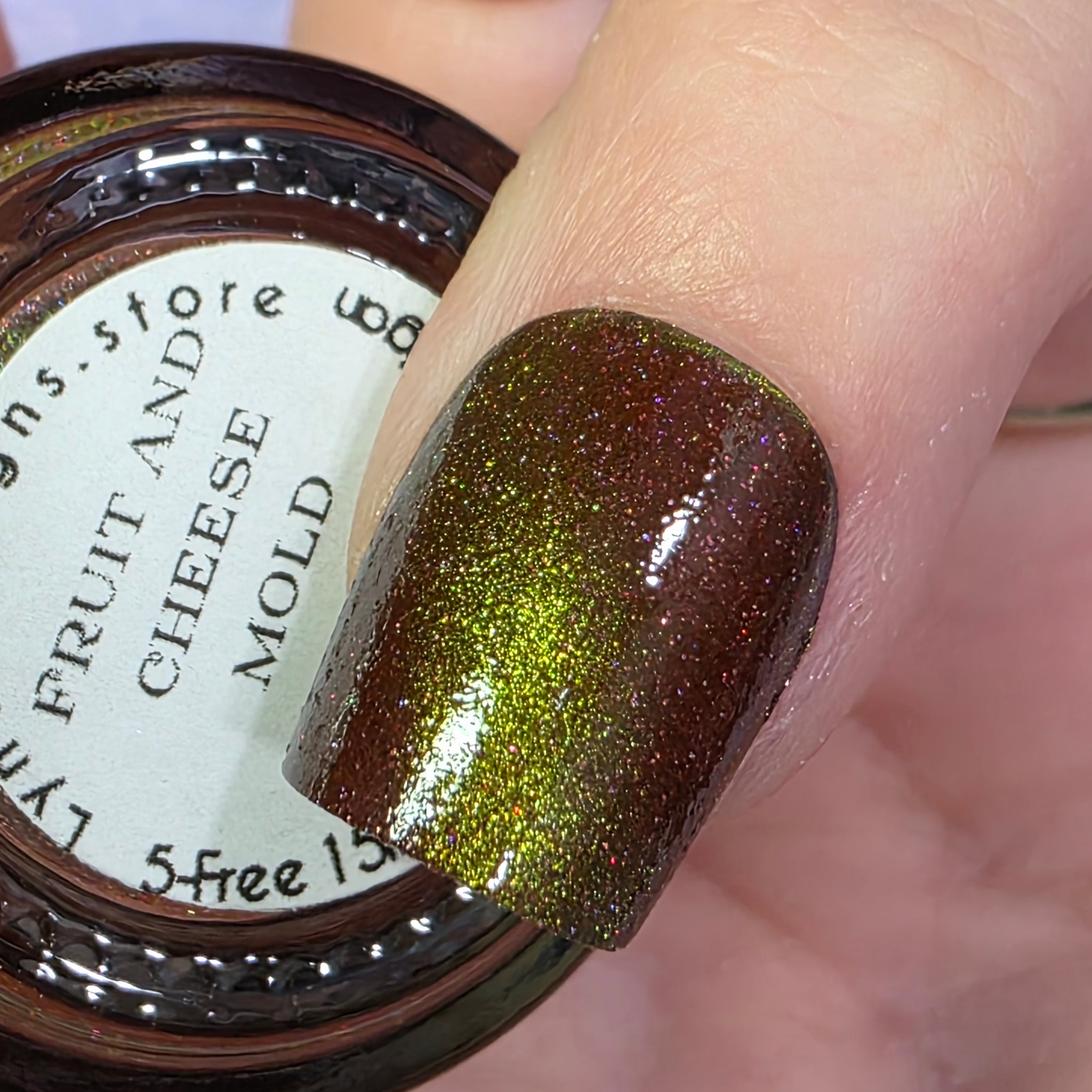 Fruit and Cheese Mold- russet base with green to gold to blue magnetic multichrome pull and scattered cherry pink holo