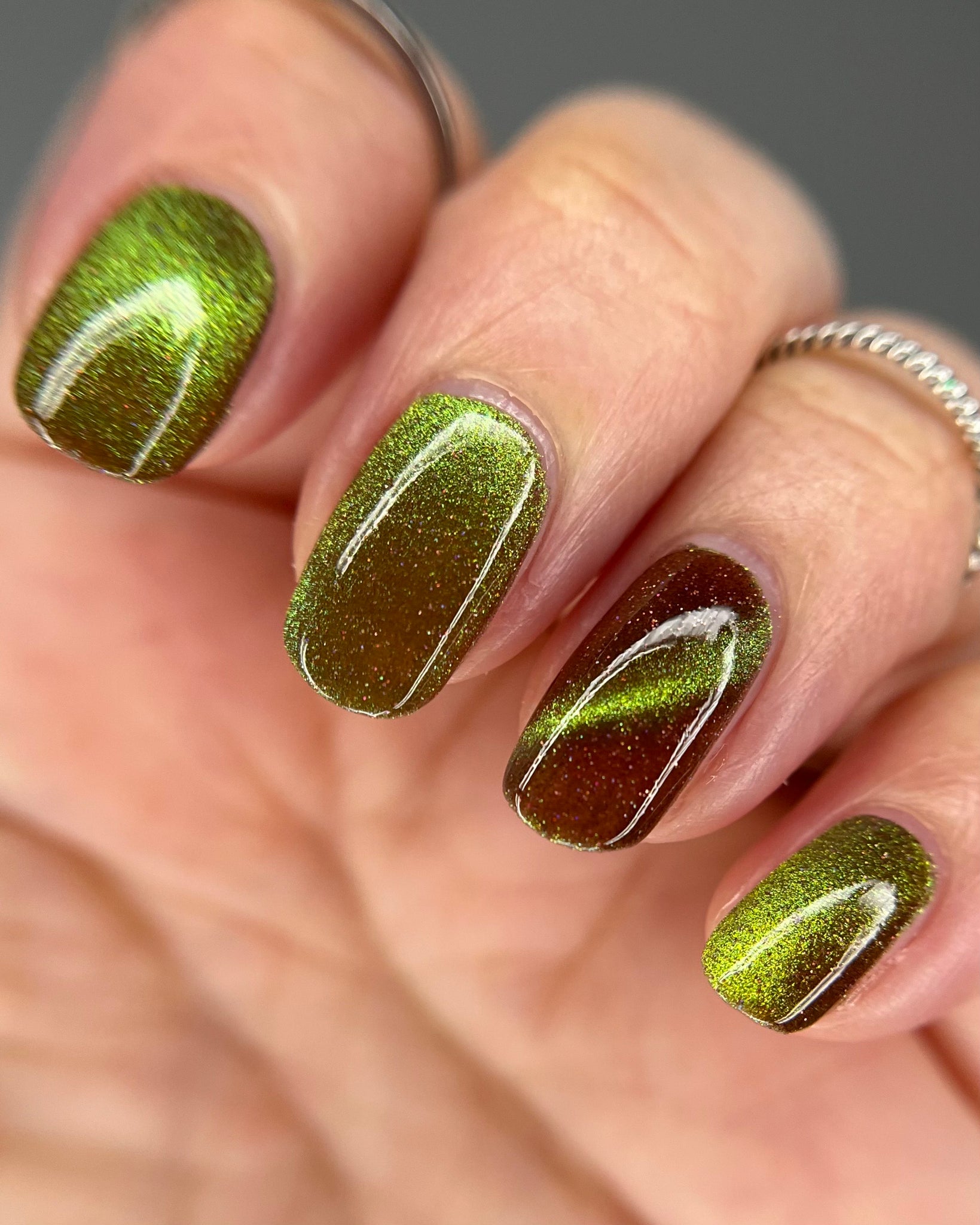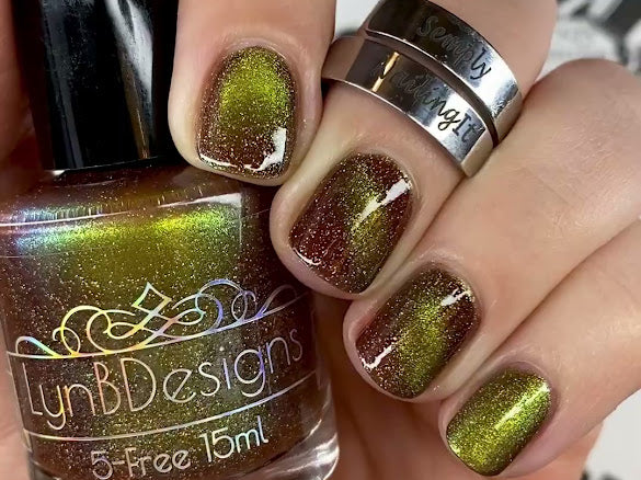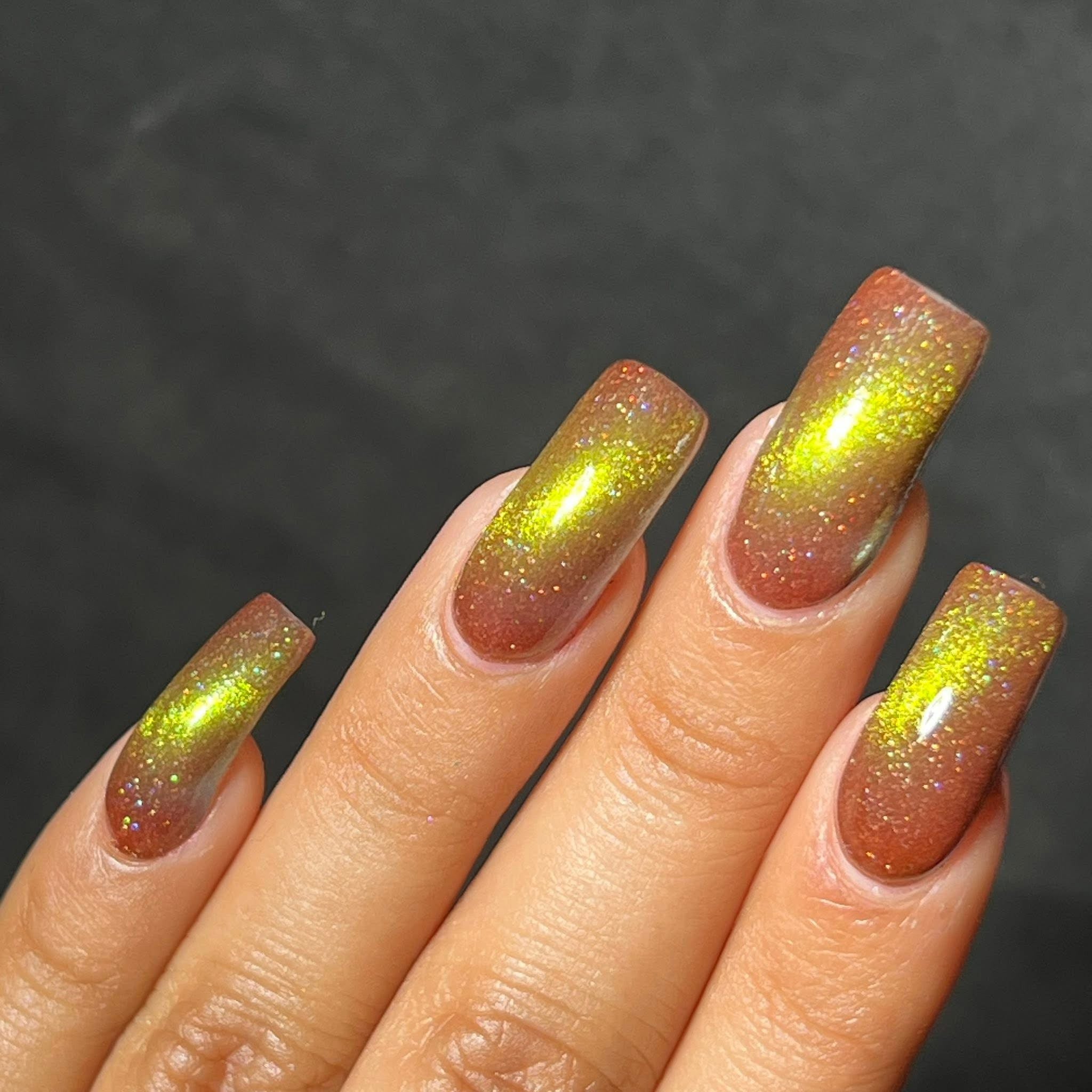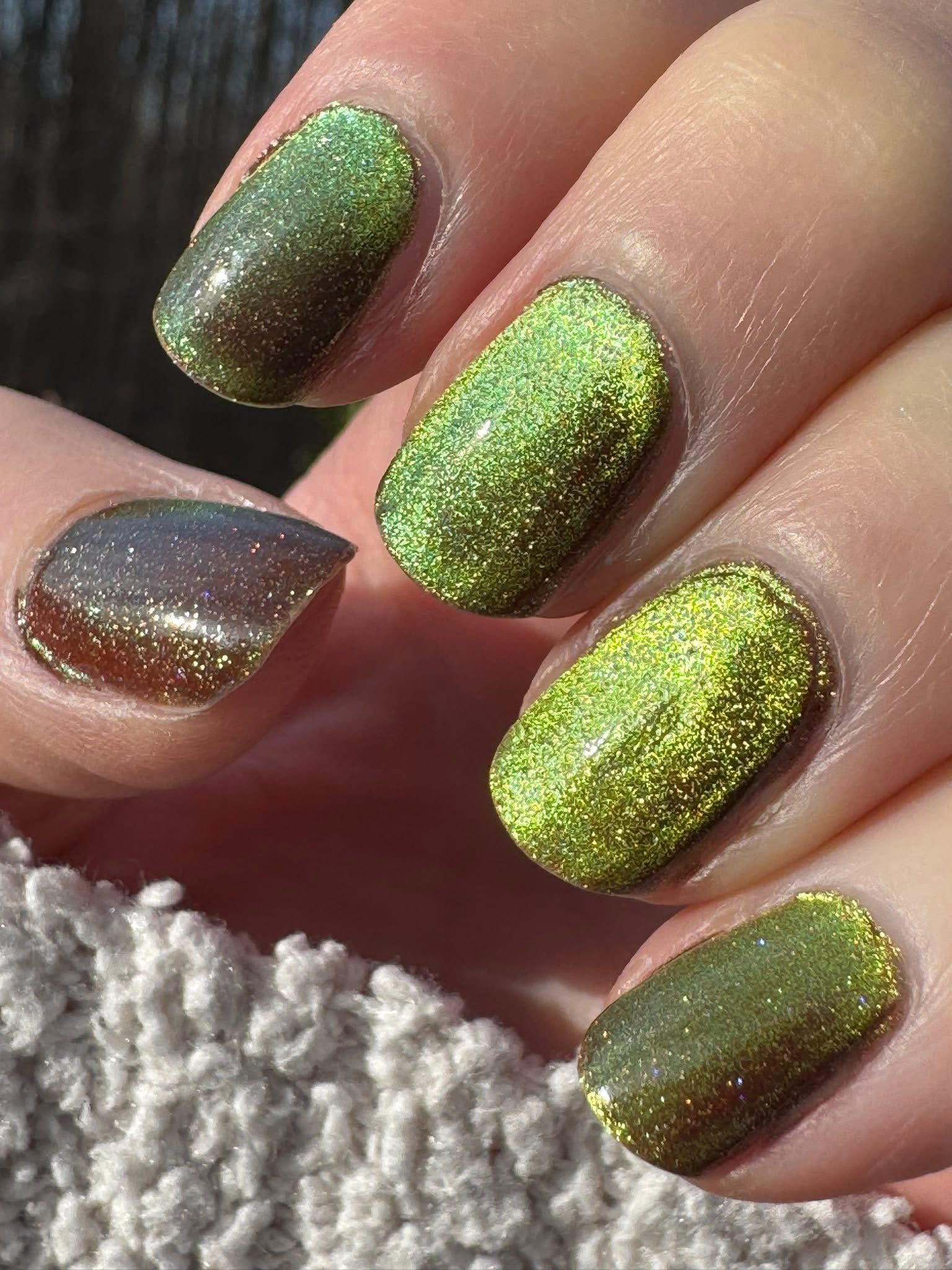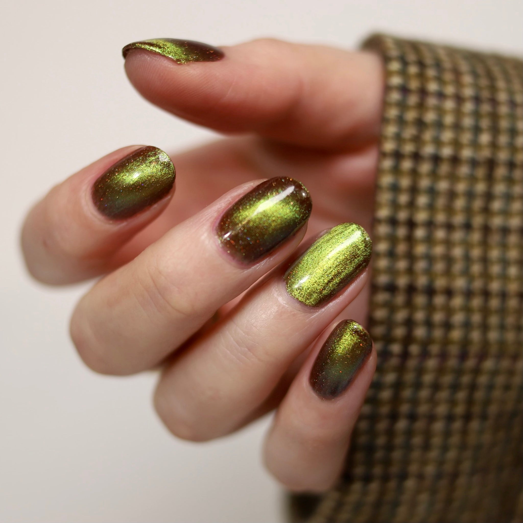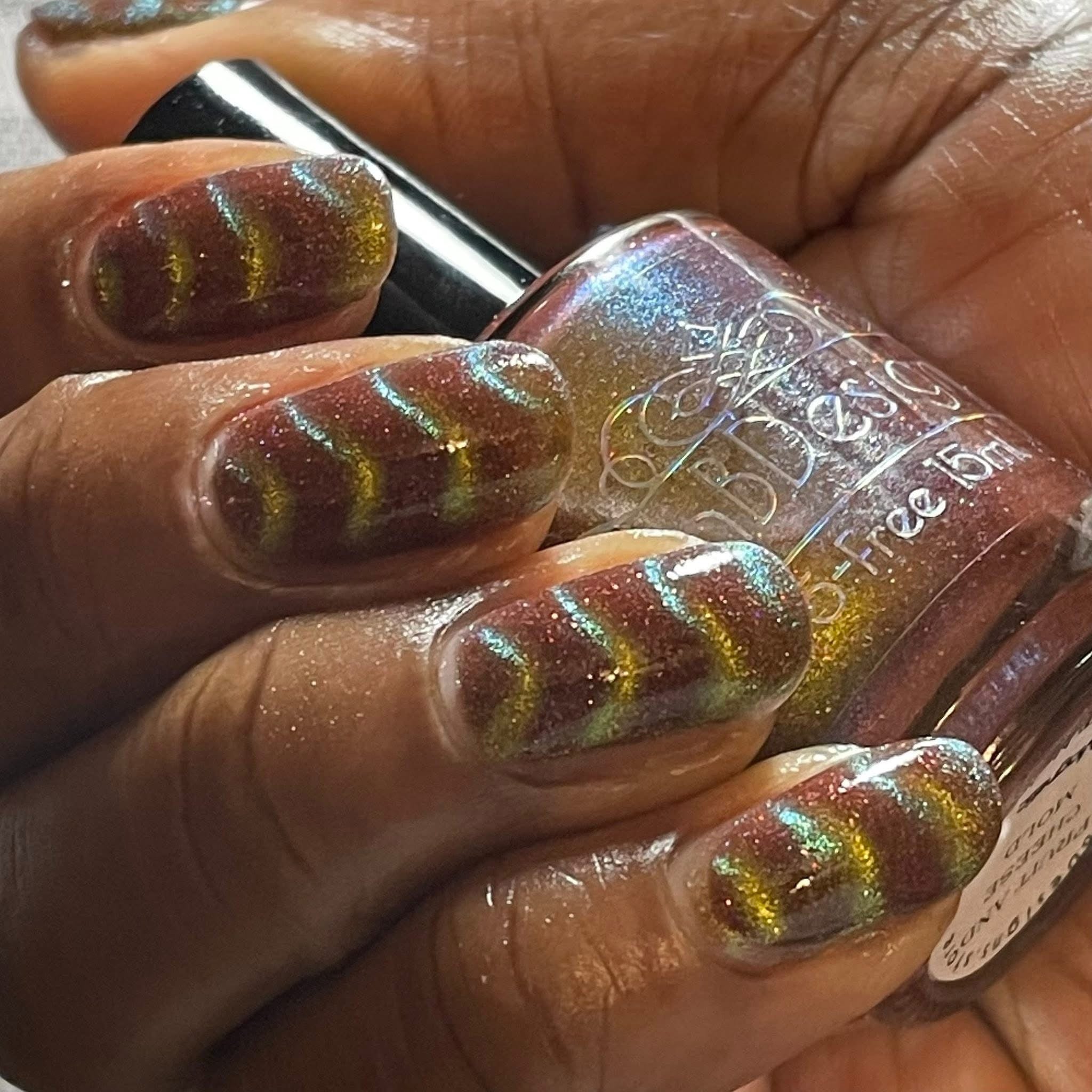 Fruit and Cheese Mold- russet base with green to gold to blue magnetic multichrome pull and scattered cherry pink holo