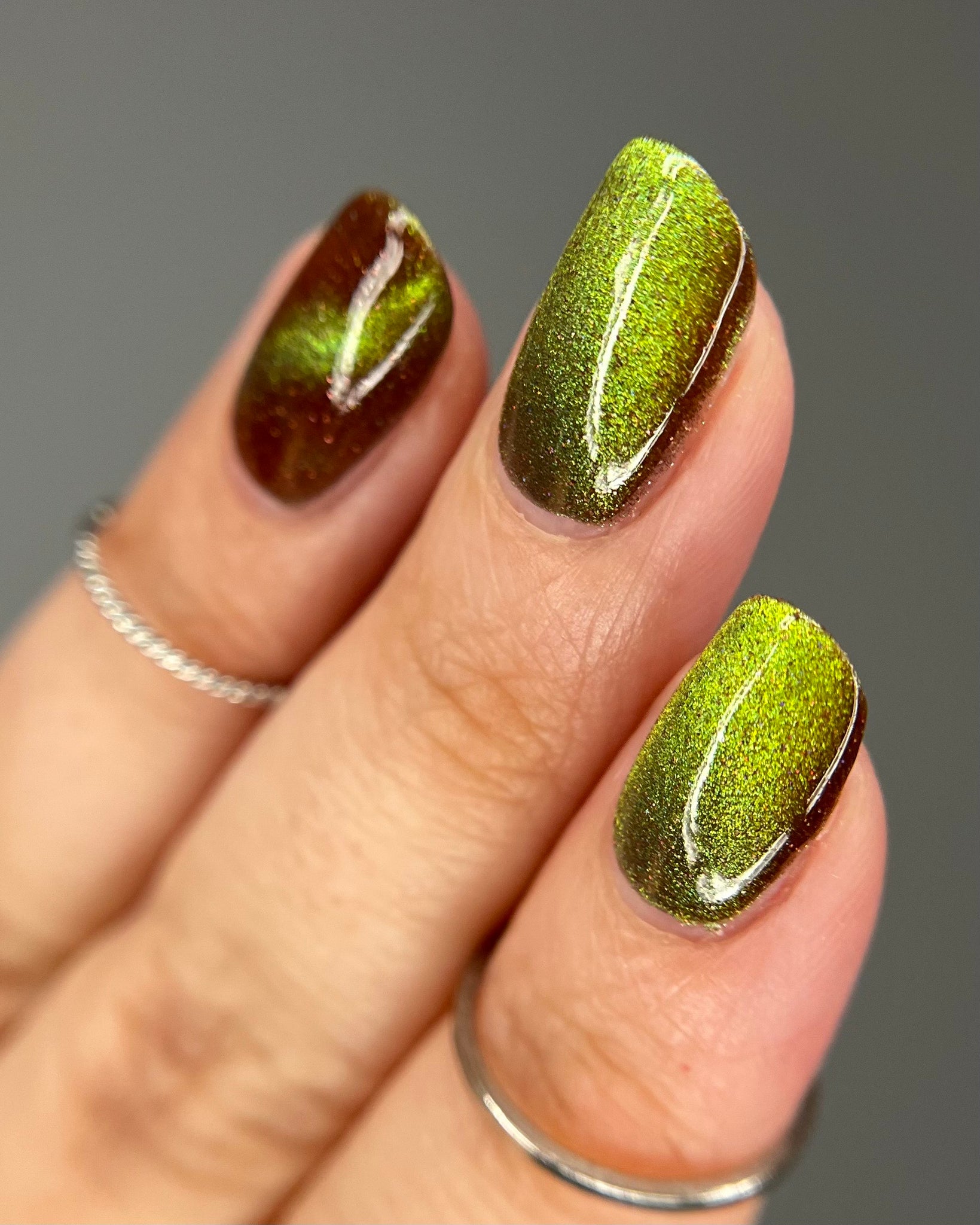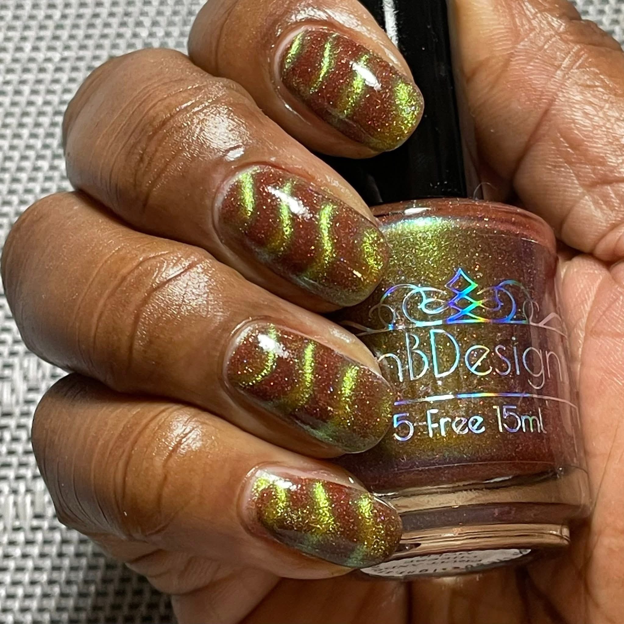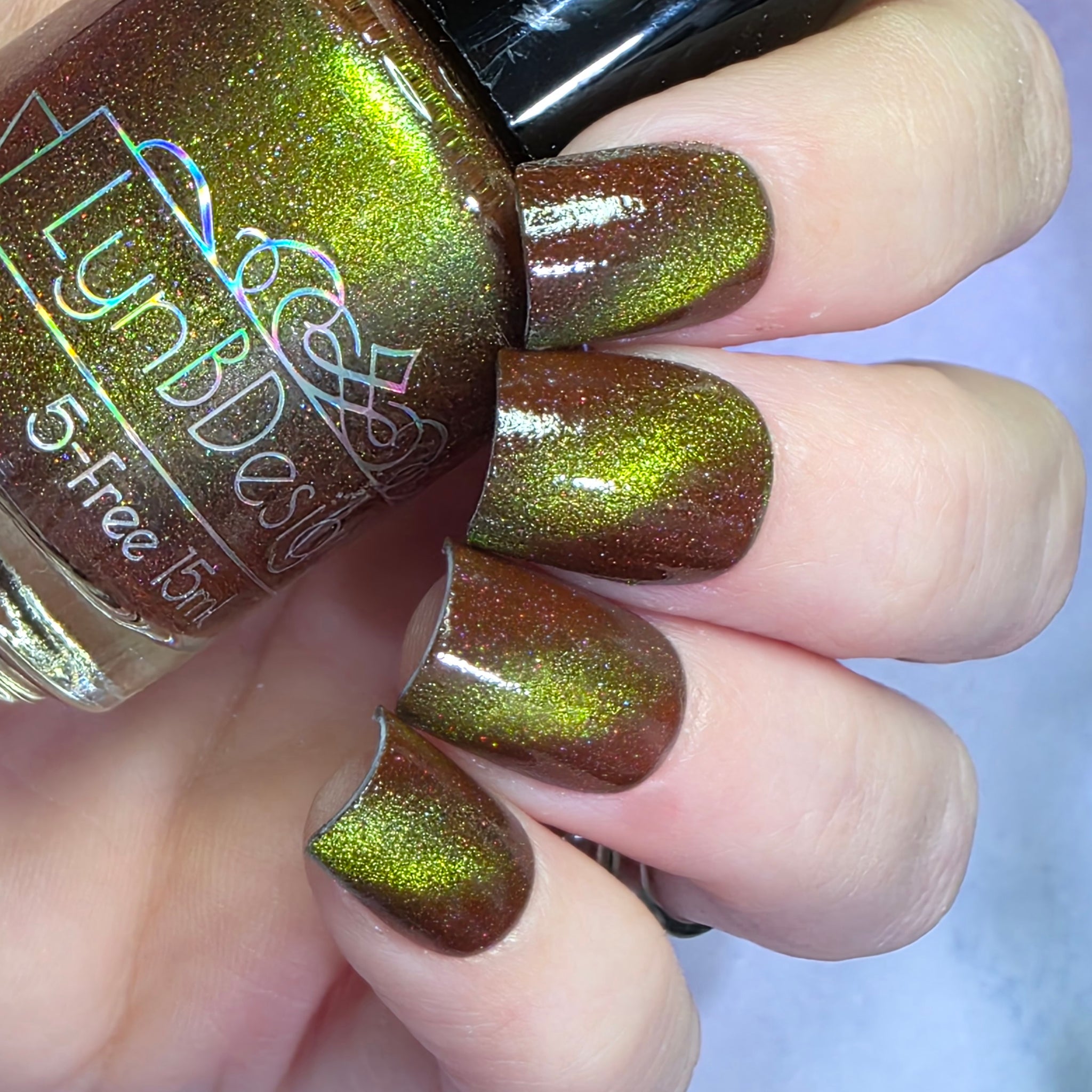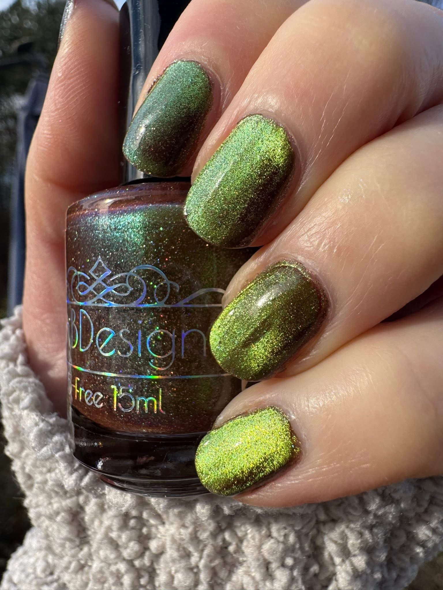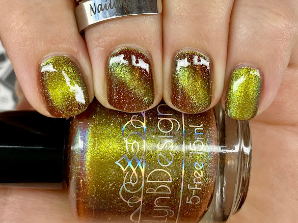 Fruit and Cheese Mold- russet base with green to gold to blue magnetic multichrome pull and scattered cherry pink holo