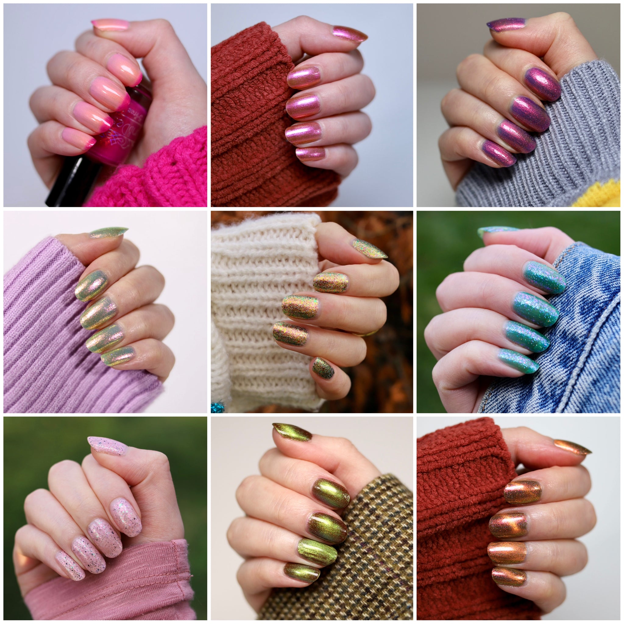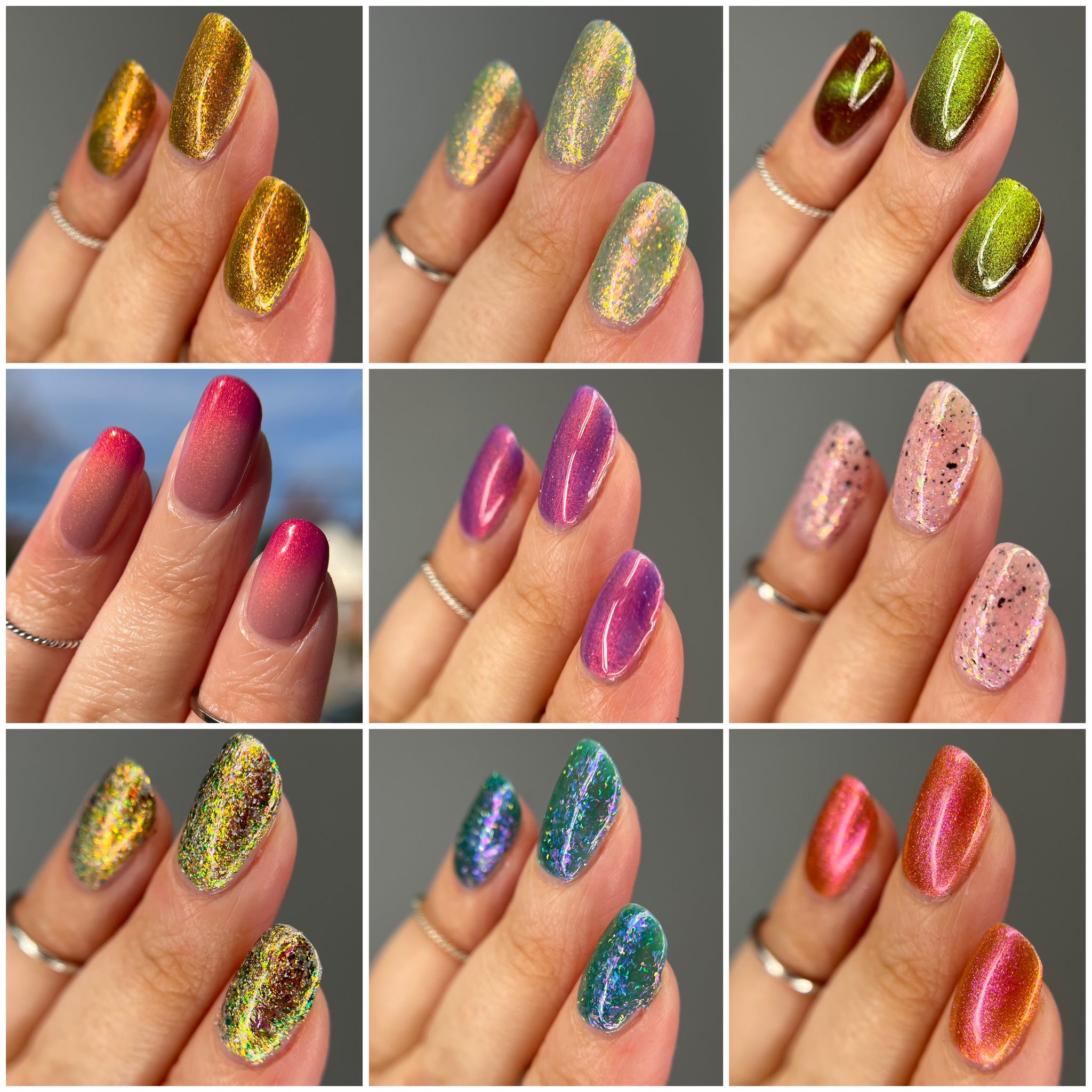 Frog Eye Salad- linear holo base with pink to orange shifting micro flakie shimmer and tonal orange magnetic pull