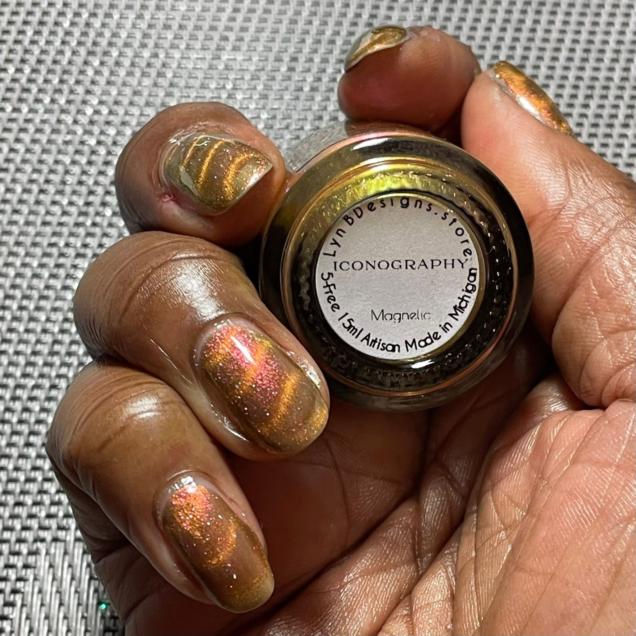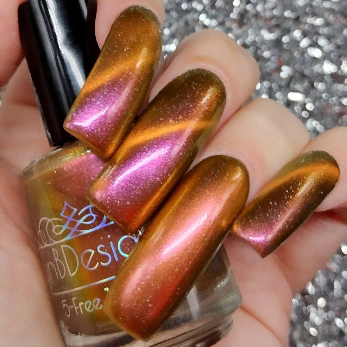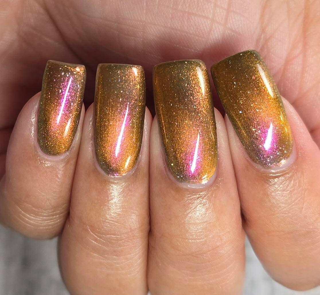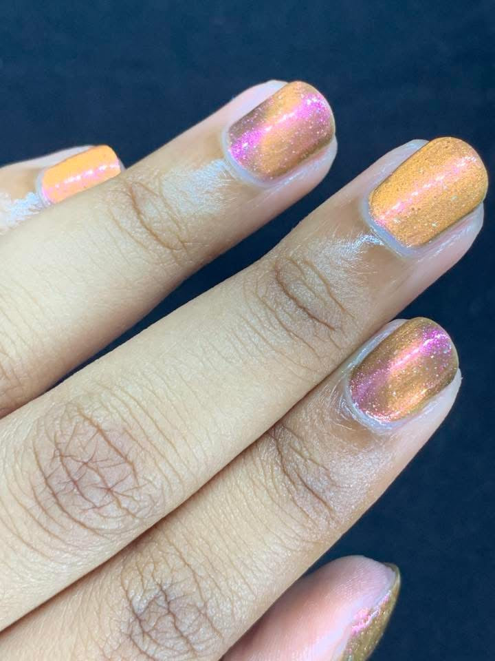 Iconography- magnetic base with copper pull filled with pink to orange shifting shimmer and added holo flakies