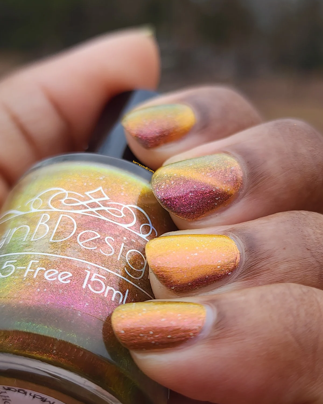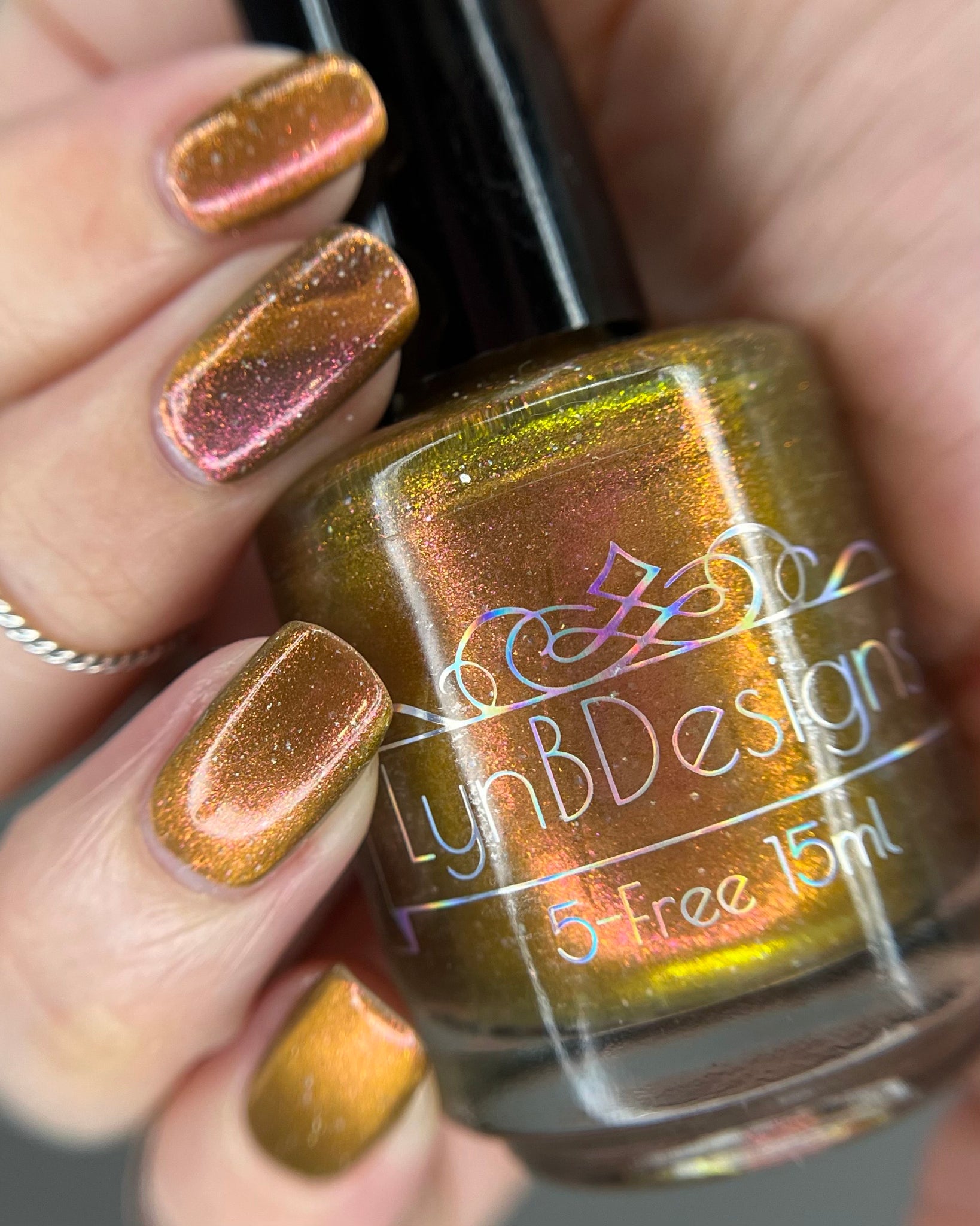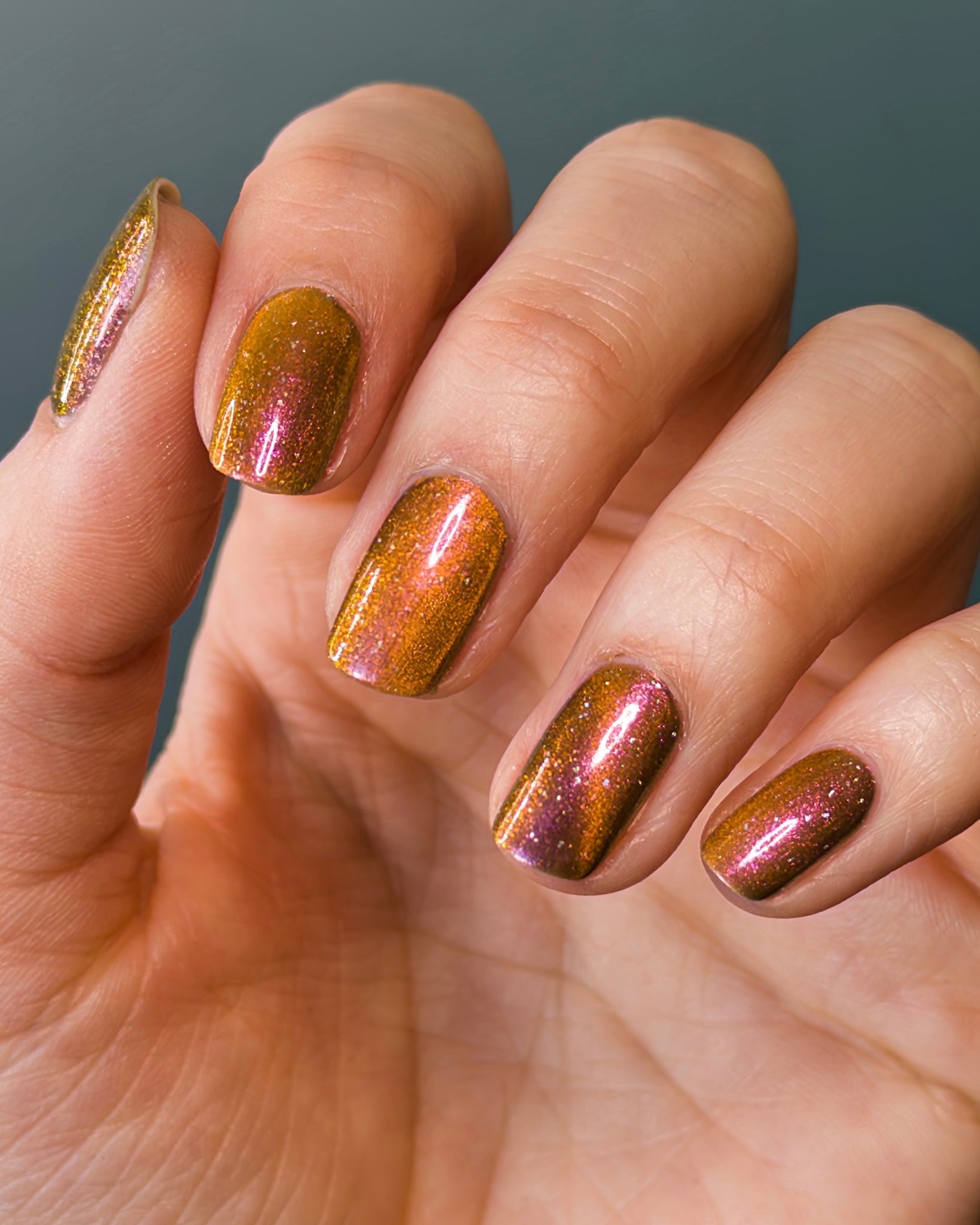 Iconography- magnetic base with copper pull filled with pink to orange shifting shimmer and added holo flakies
