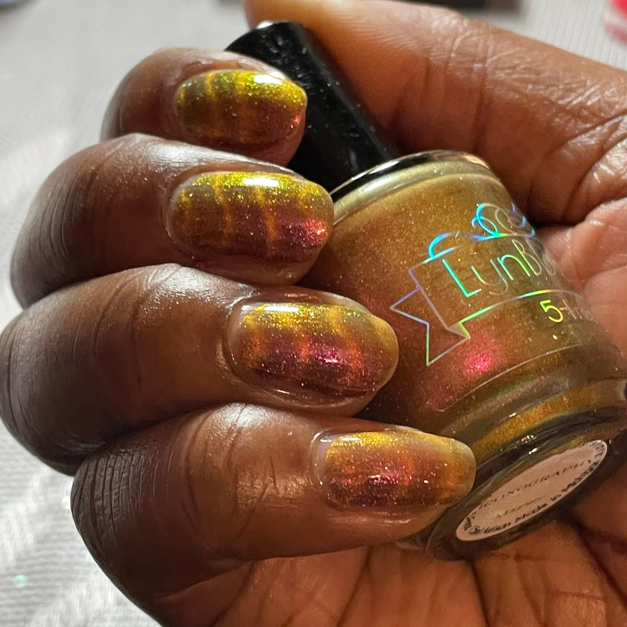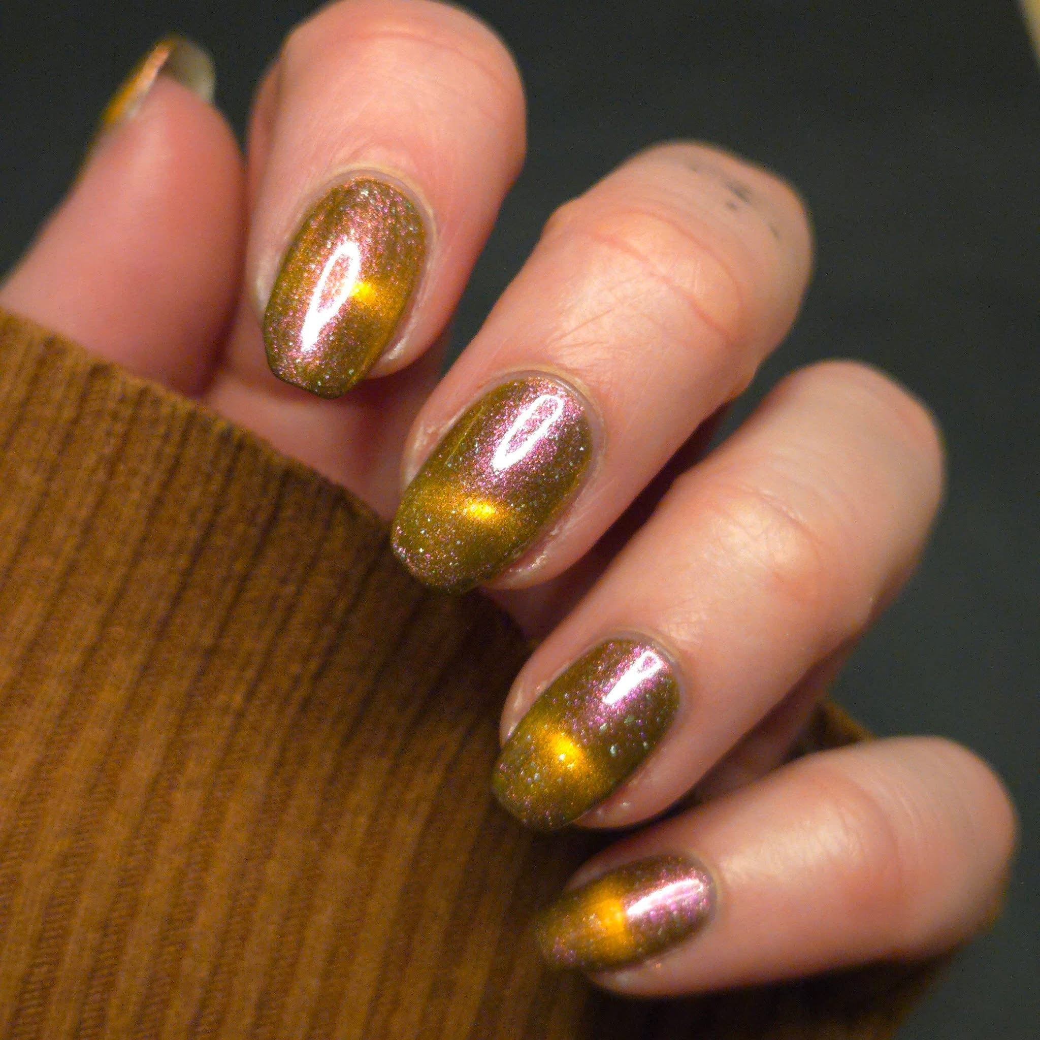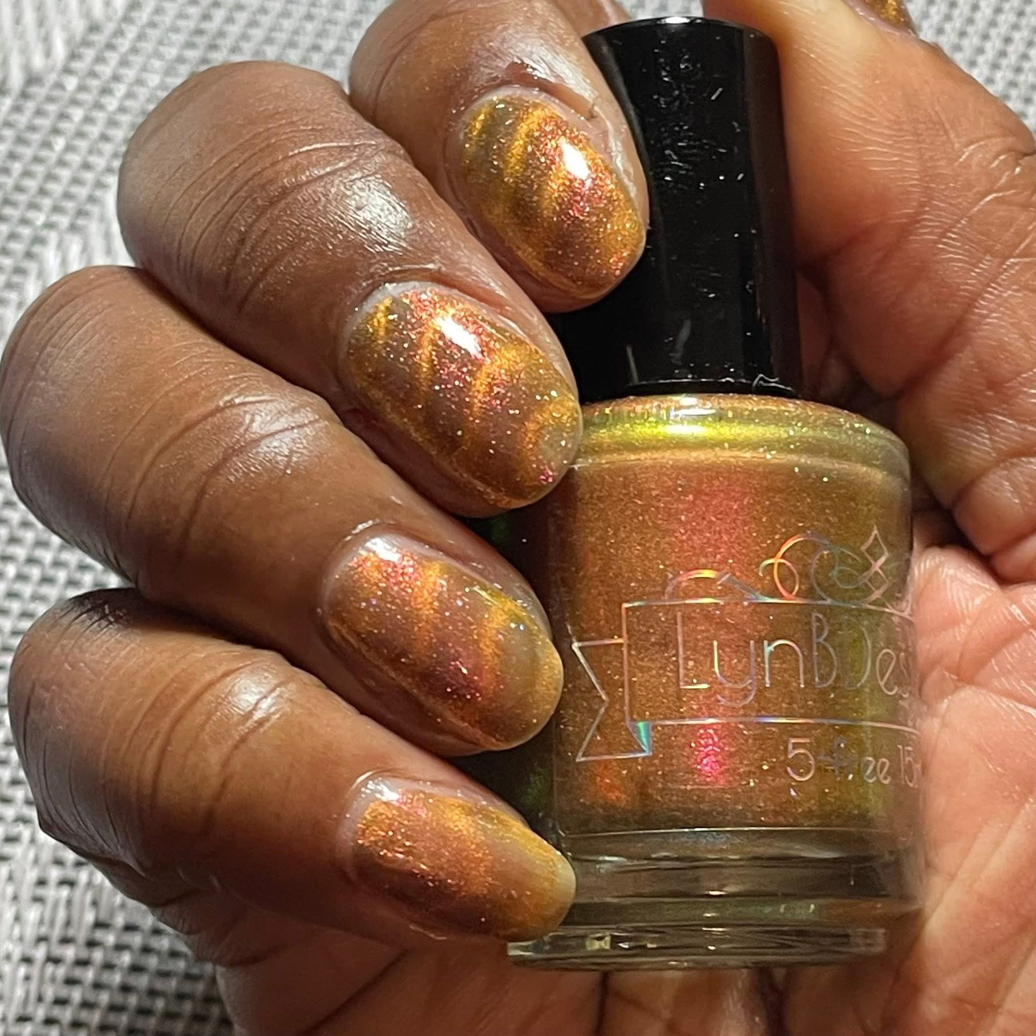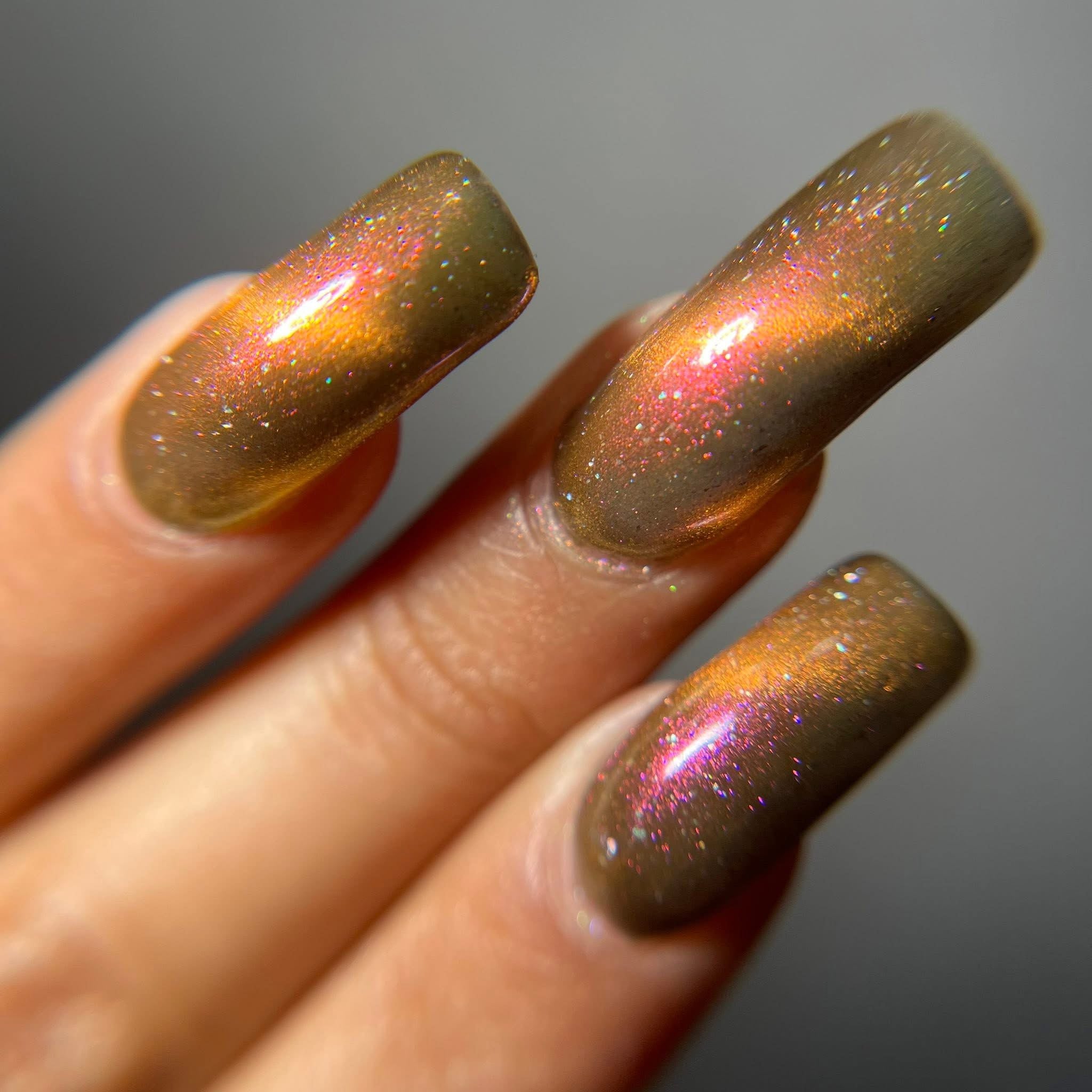 Iconography- magnetic base with copper pull filled with pink to orange shifting shimmer and added holo flakies