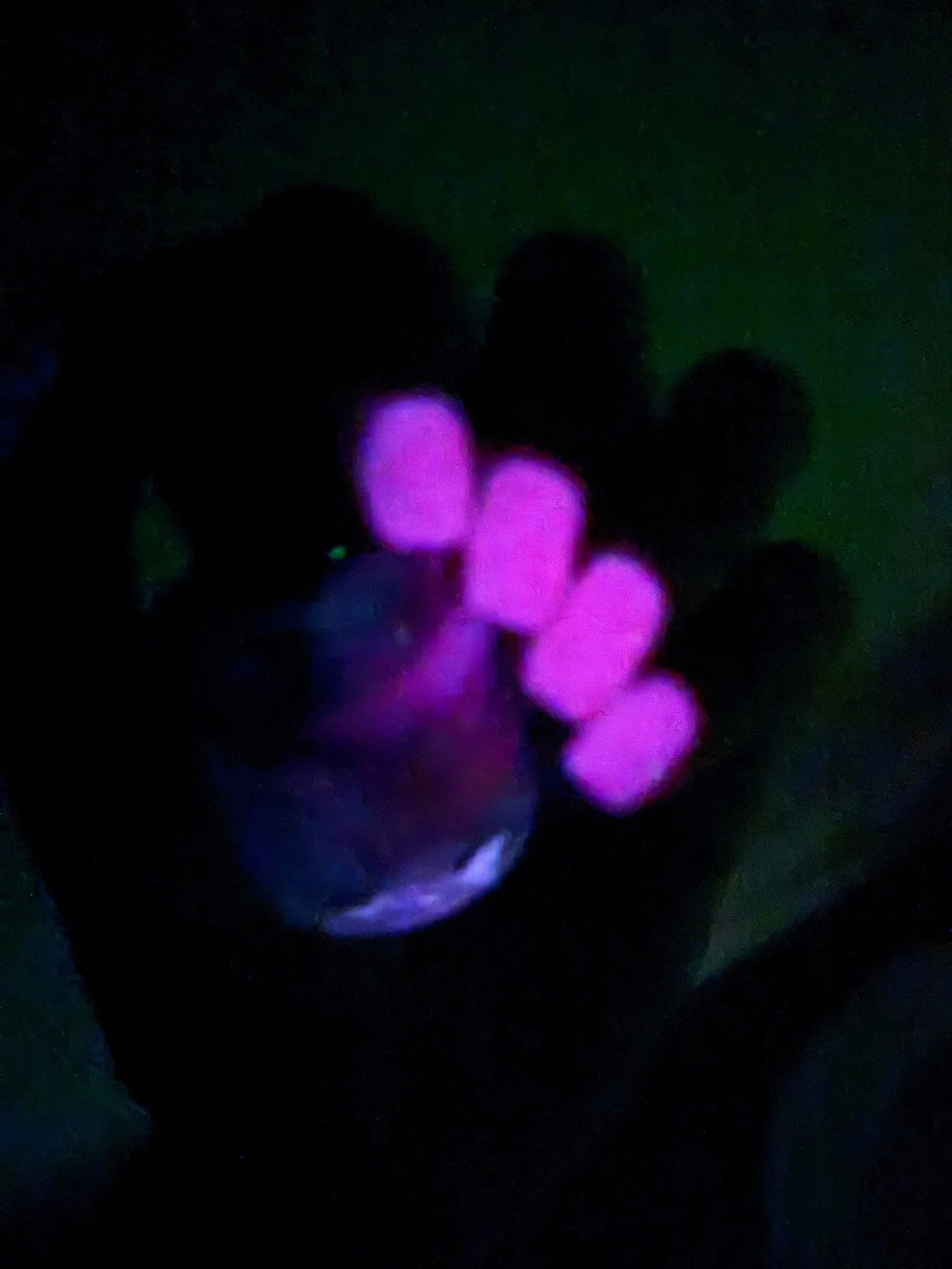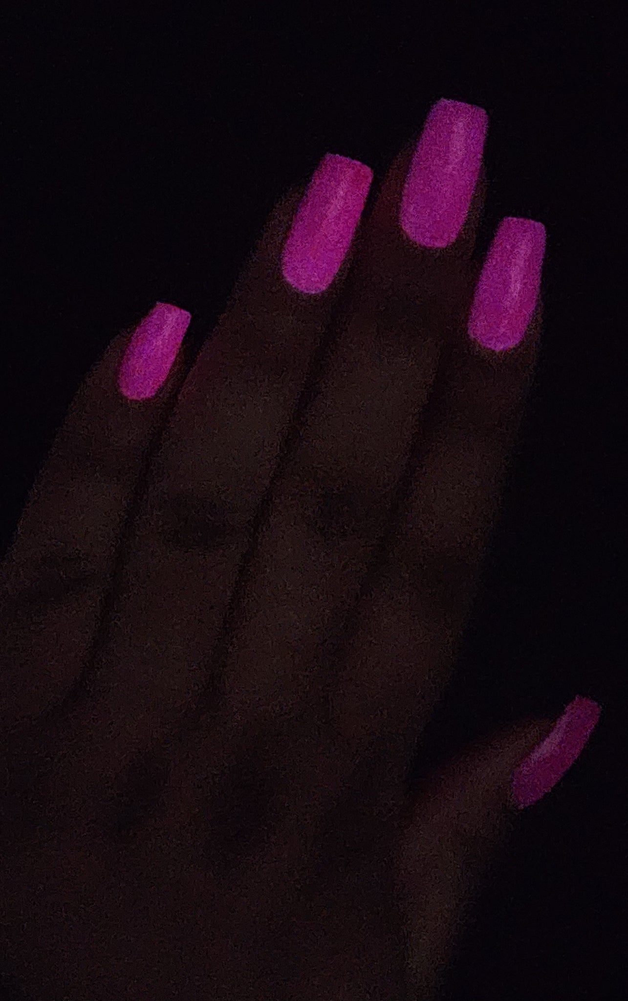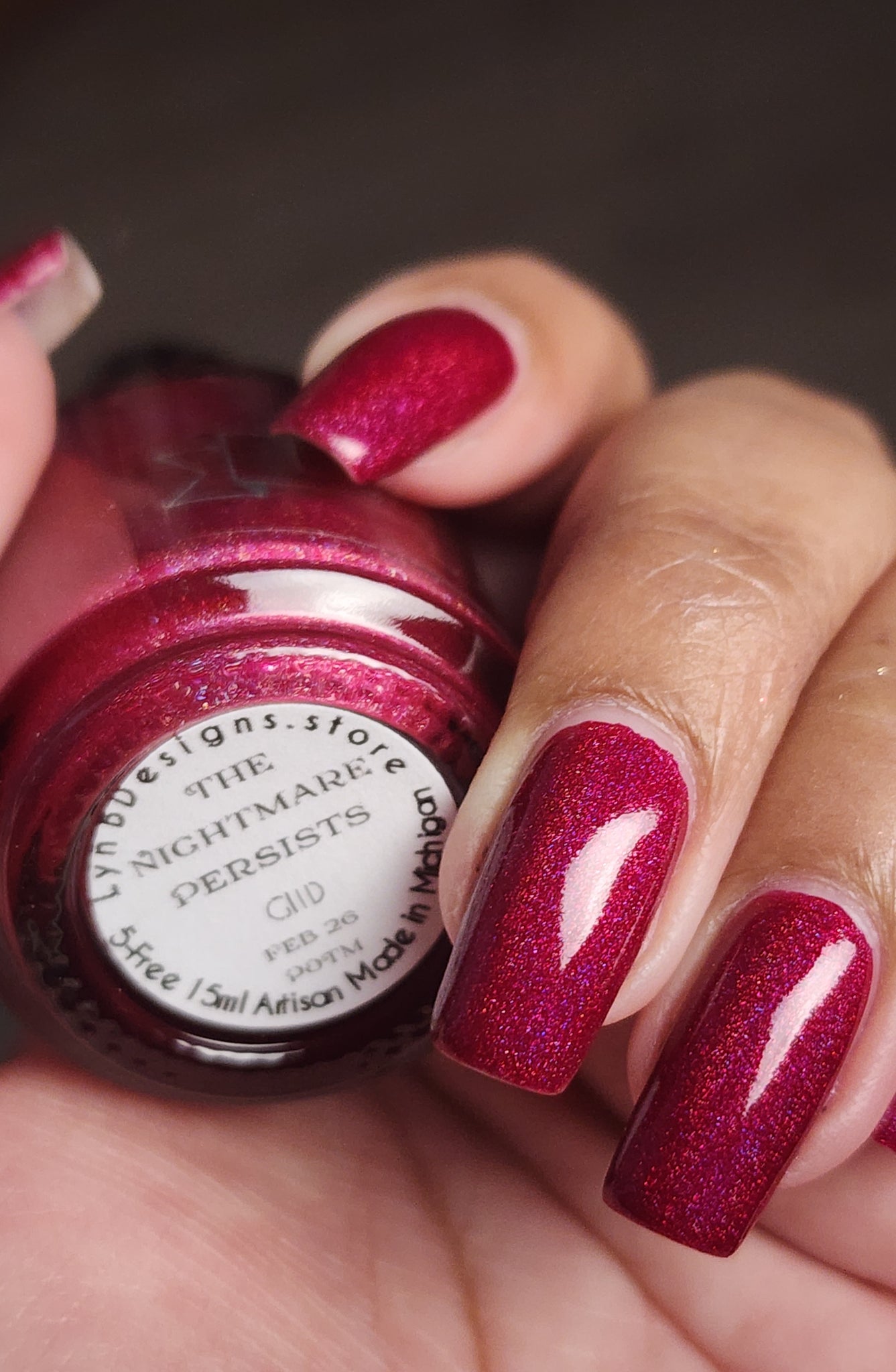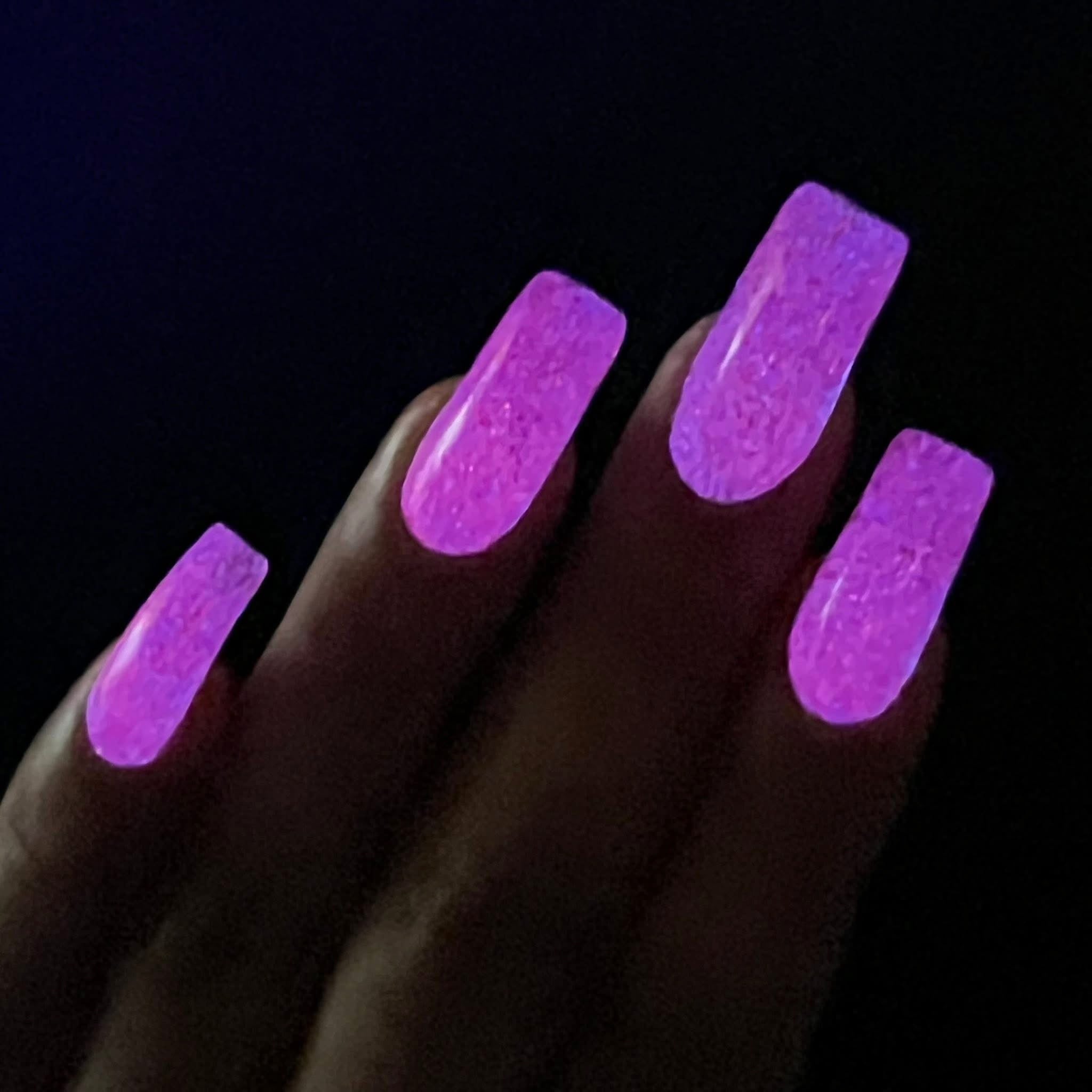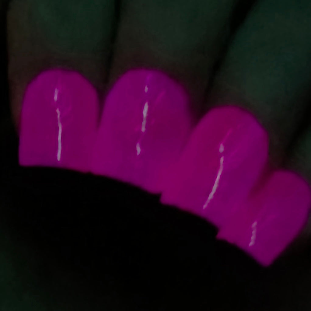 The Nightmare Persists- dark magenta linear holo with pink glow in the dark. The glow in the dark works best with a strong UV light
