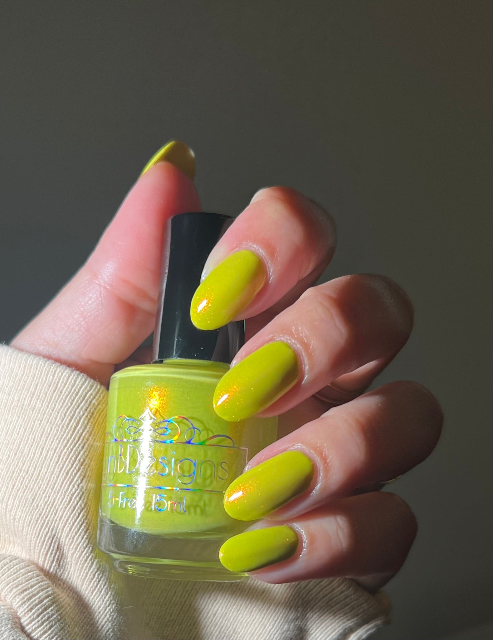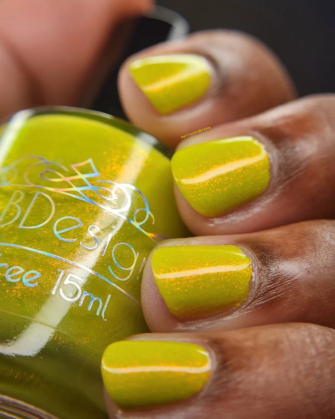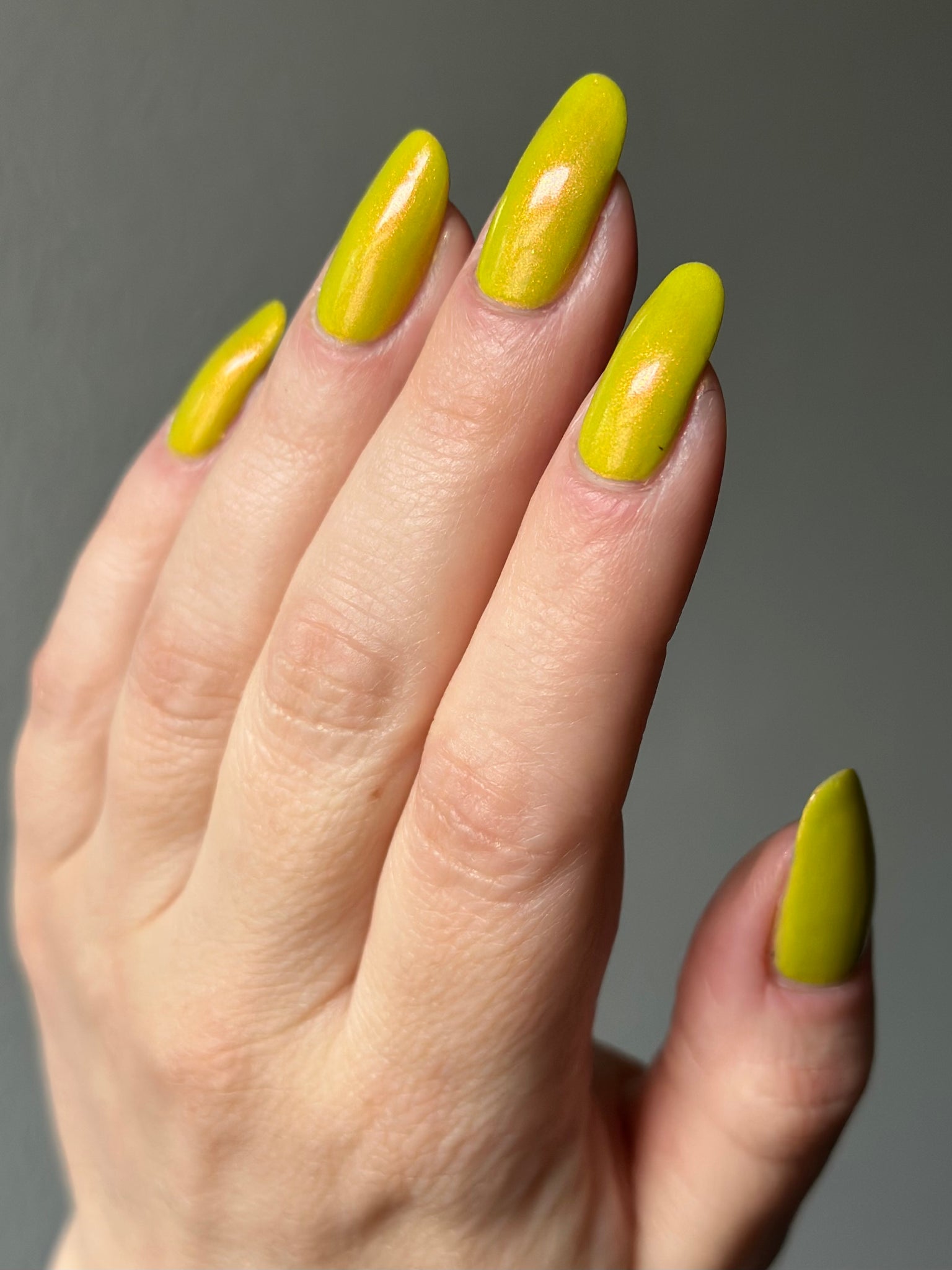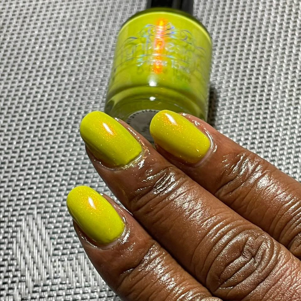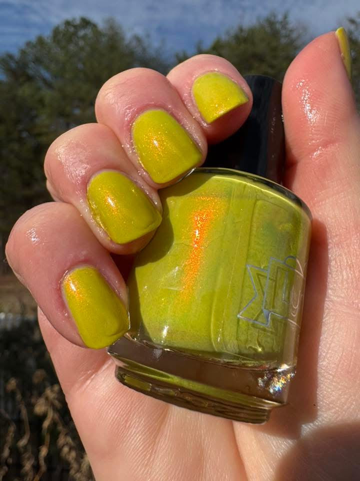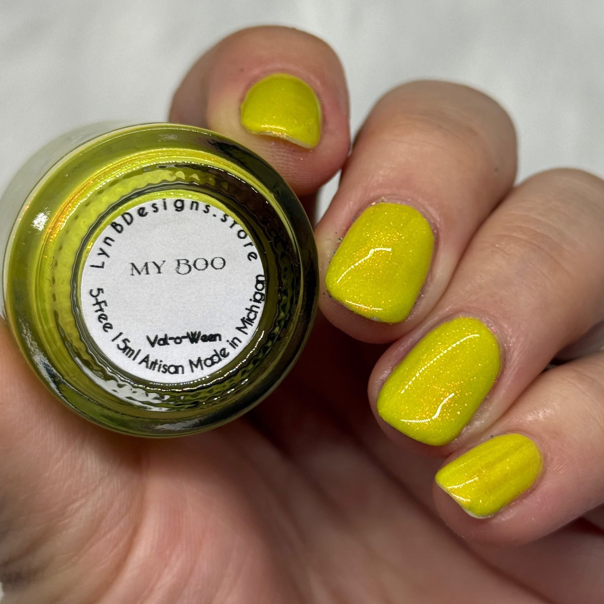 My Boo- light chartreuse base with red to orange to gold shifting shimmer