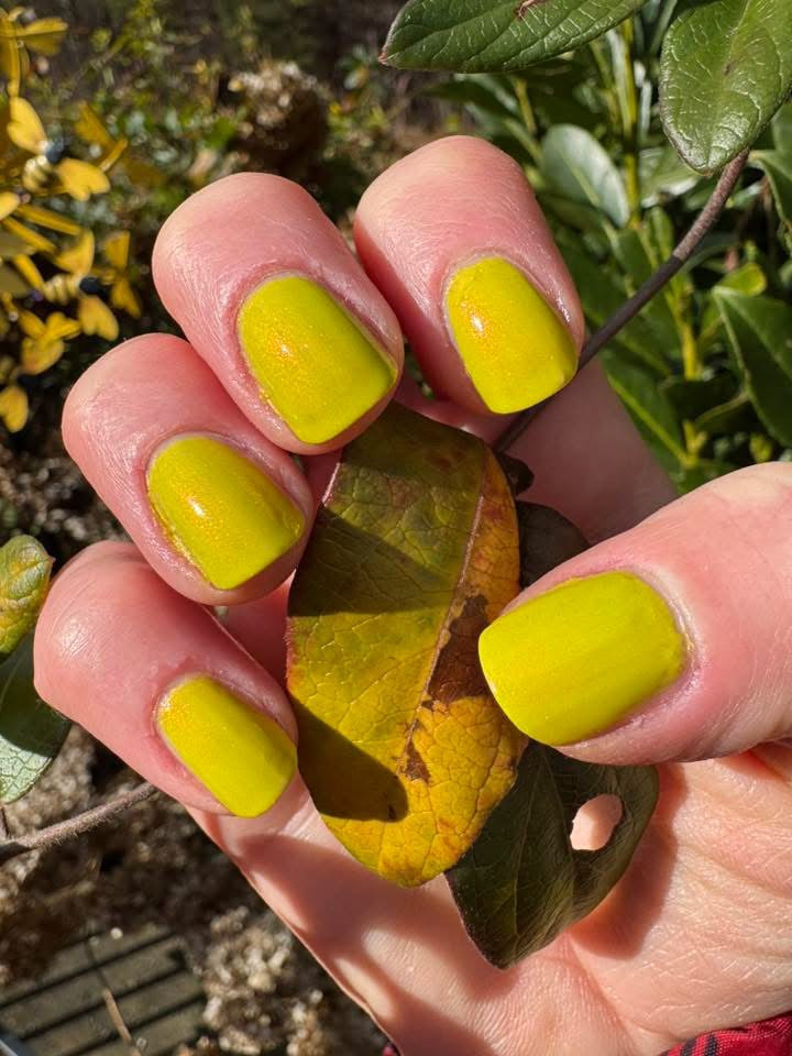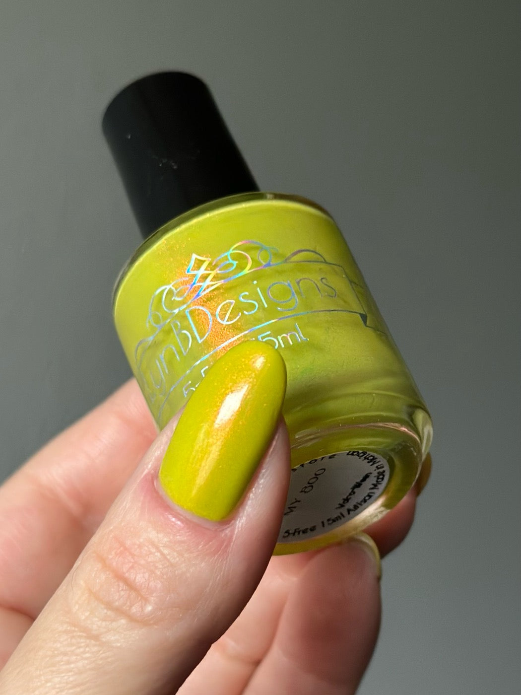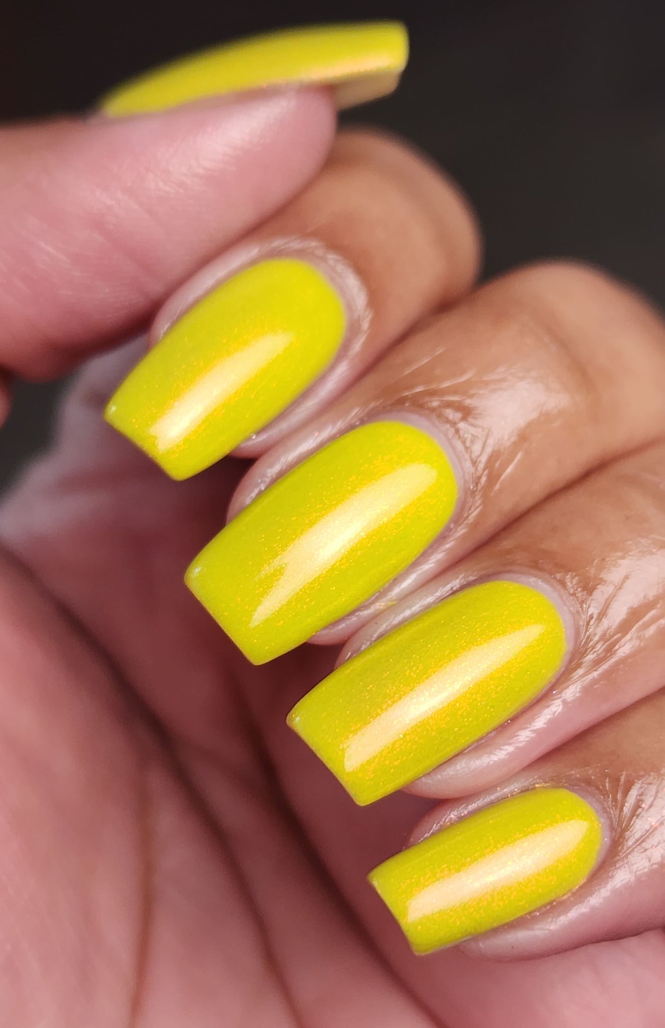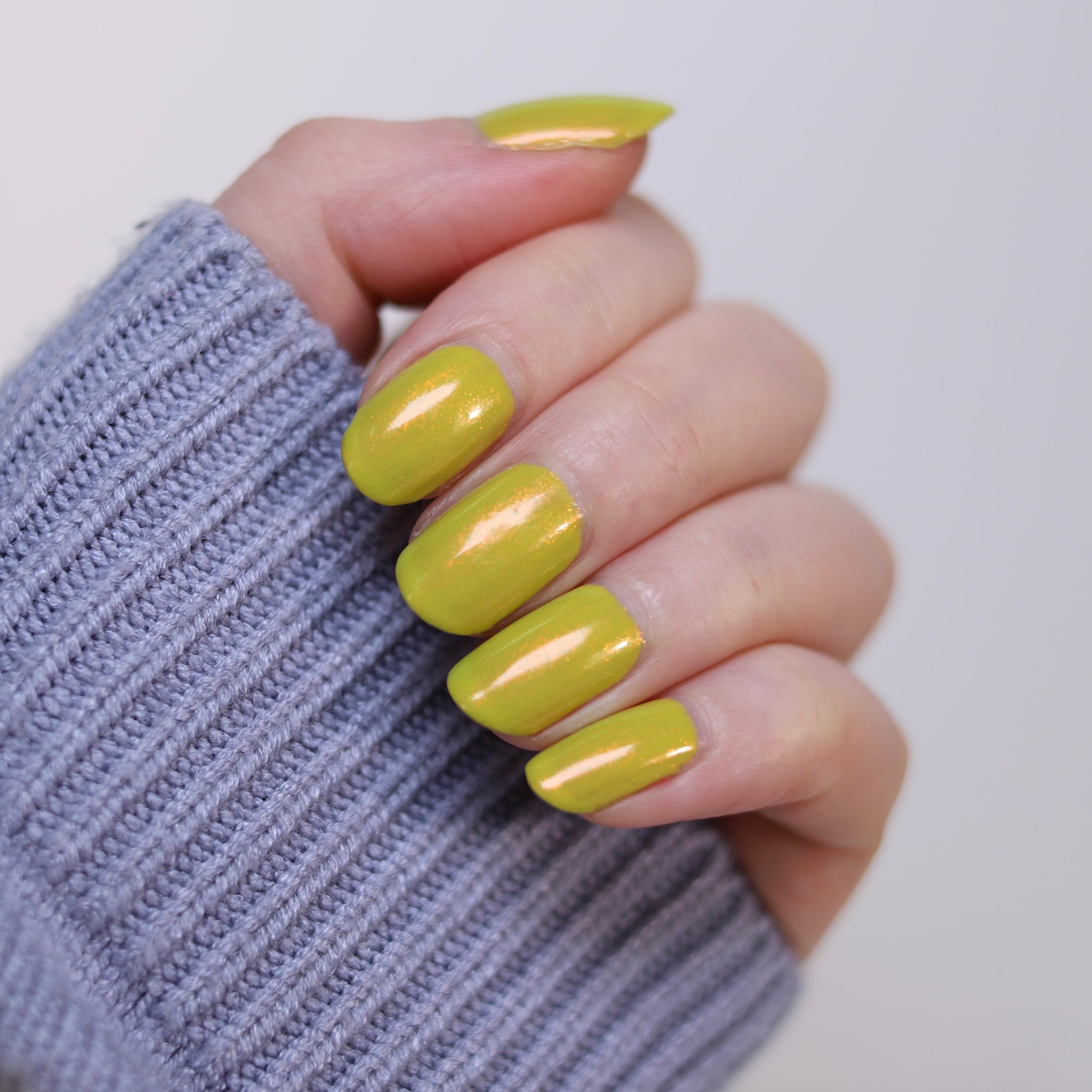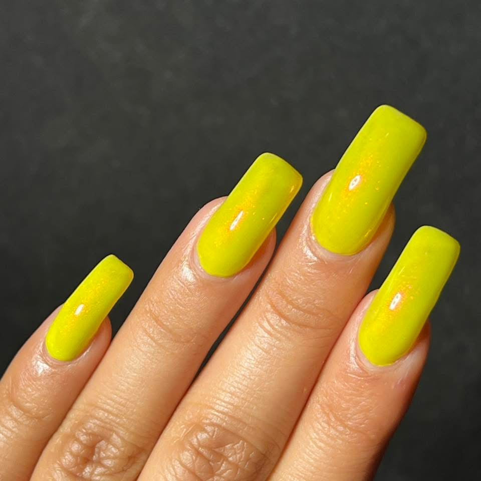 My Boo- light chartreuse base with red to orange to gold shifting shimmer