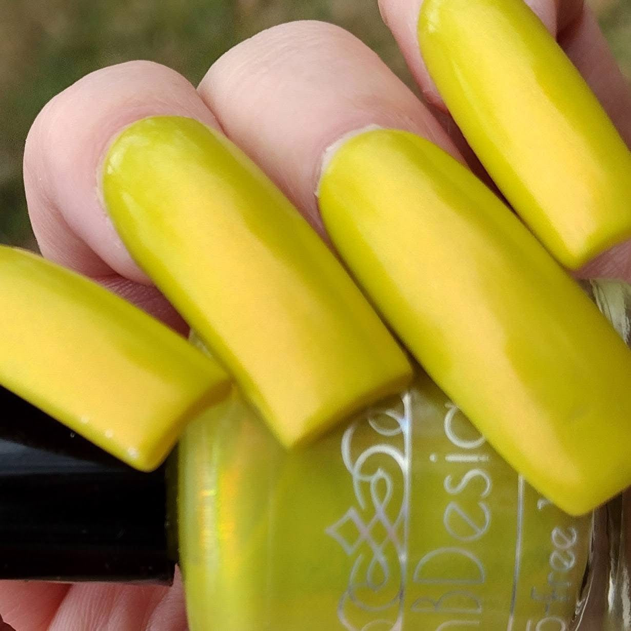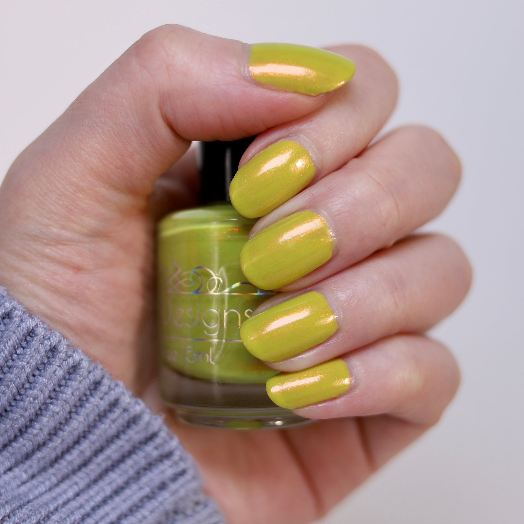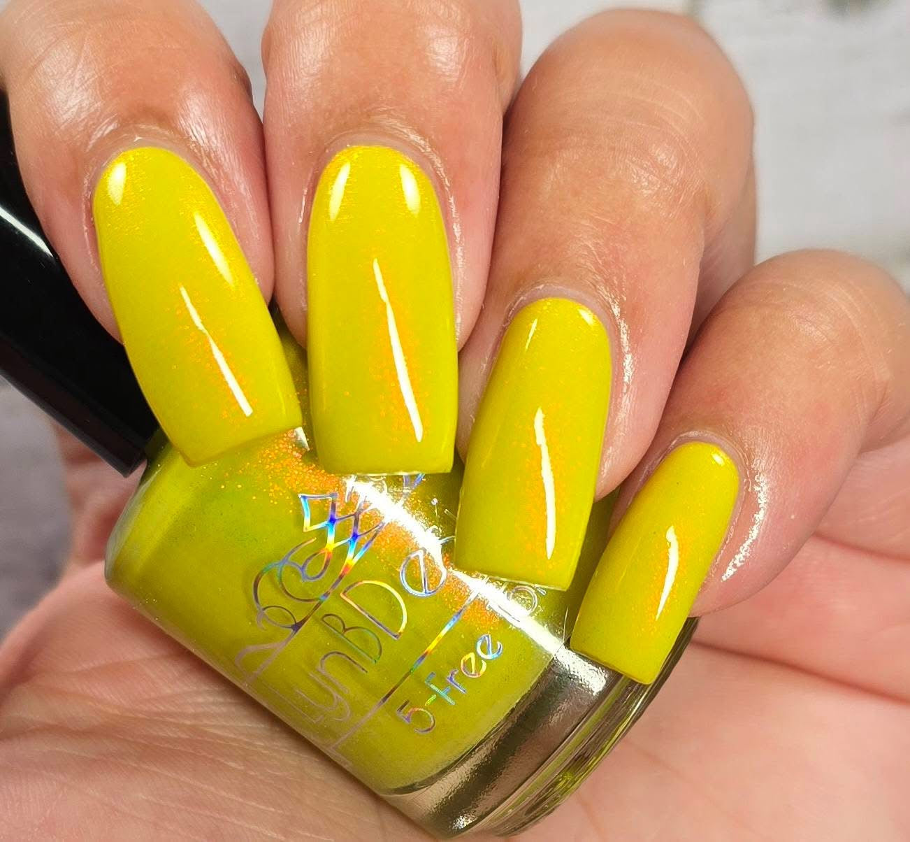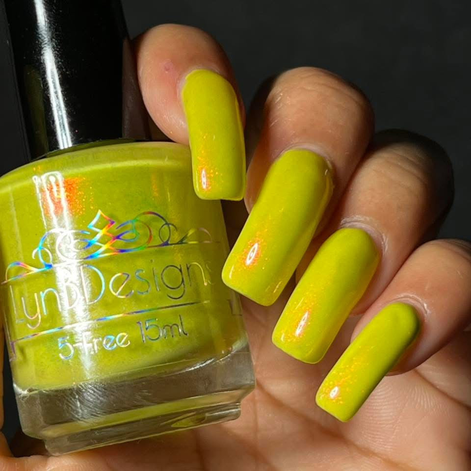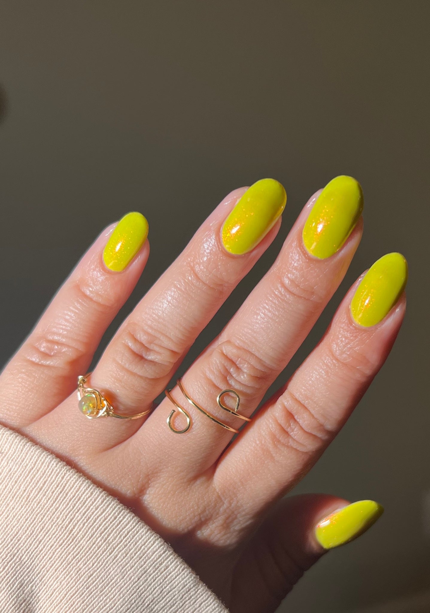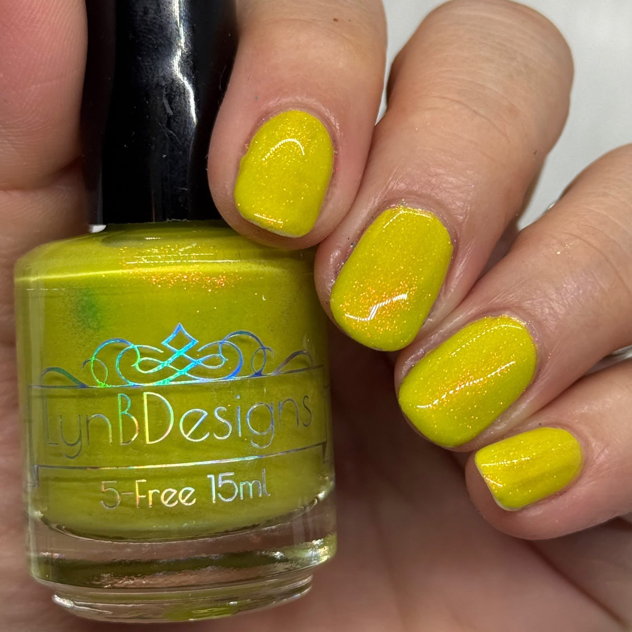 My Boo- light chartreuse base with red to orange to gold shifting shimmer