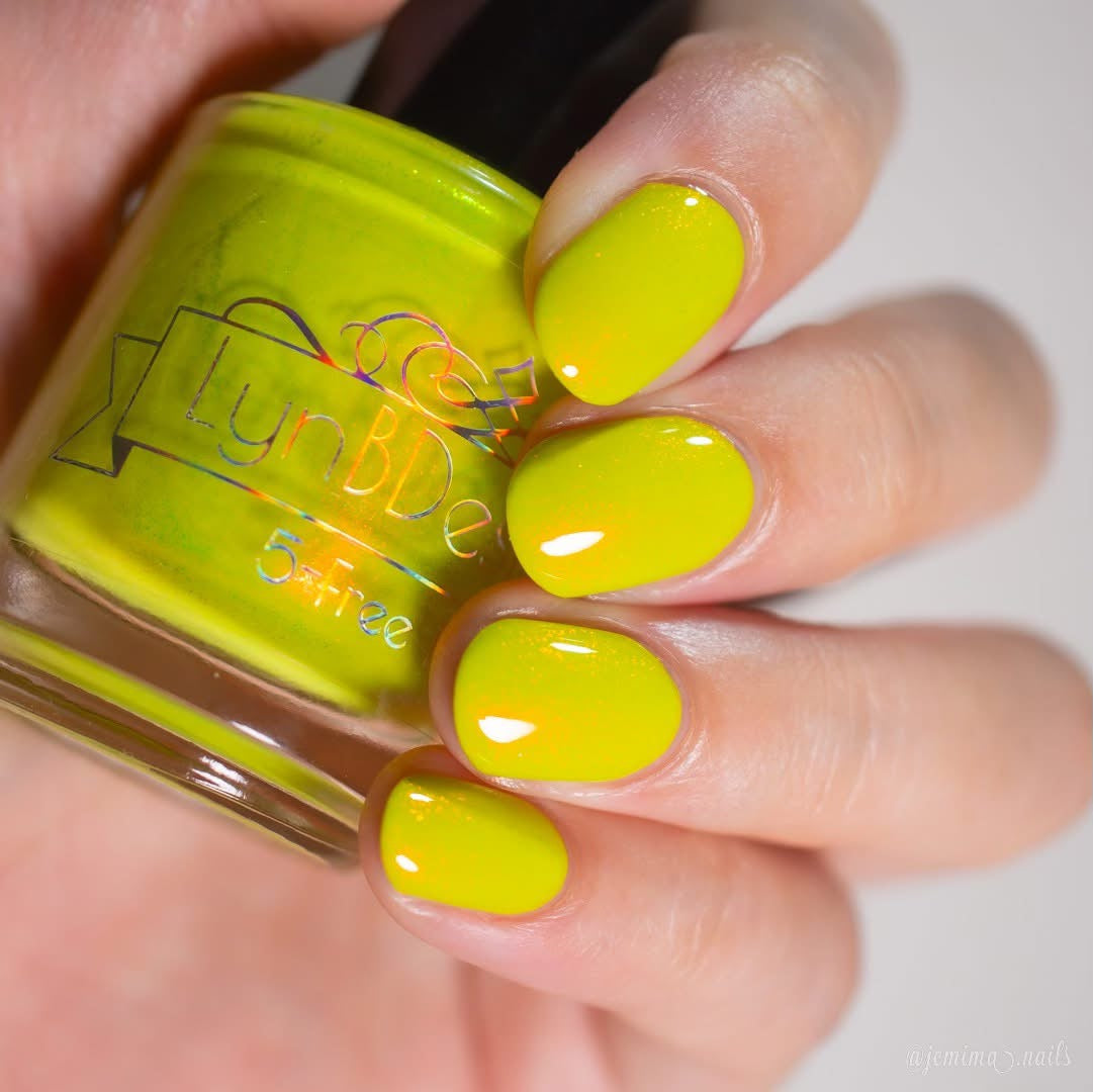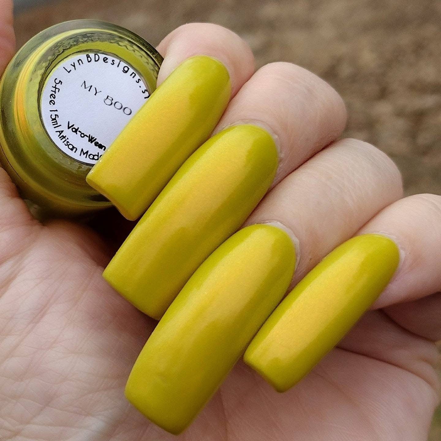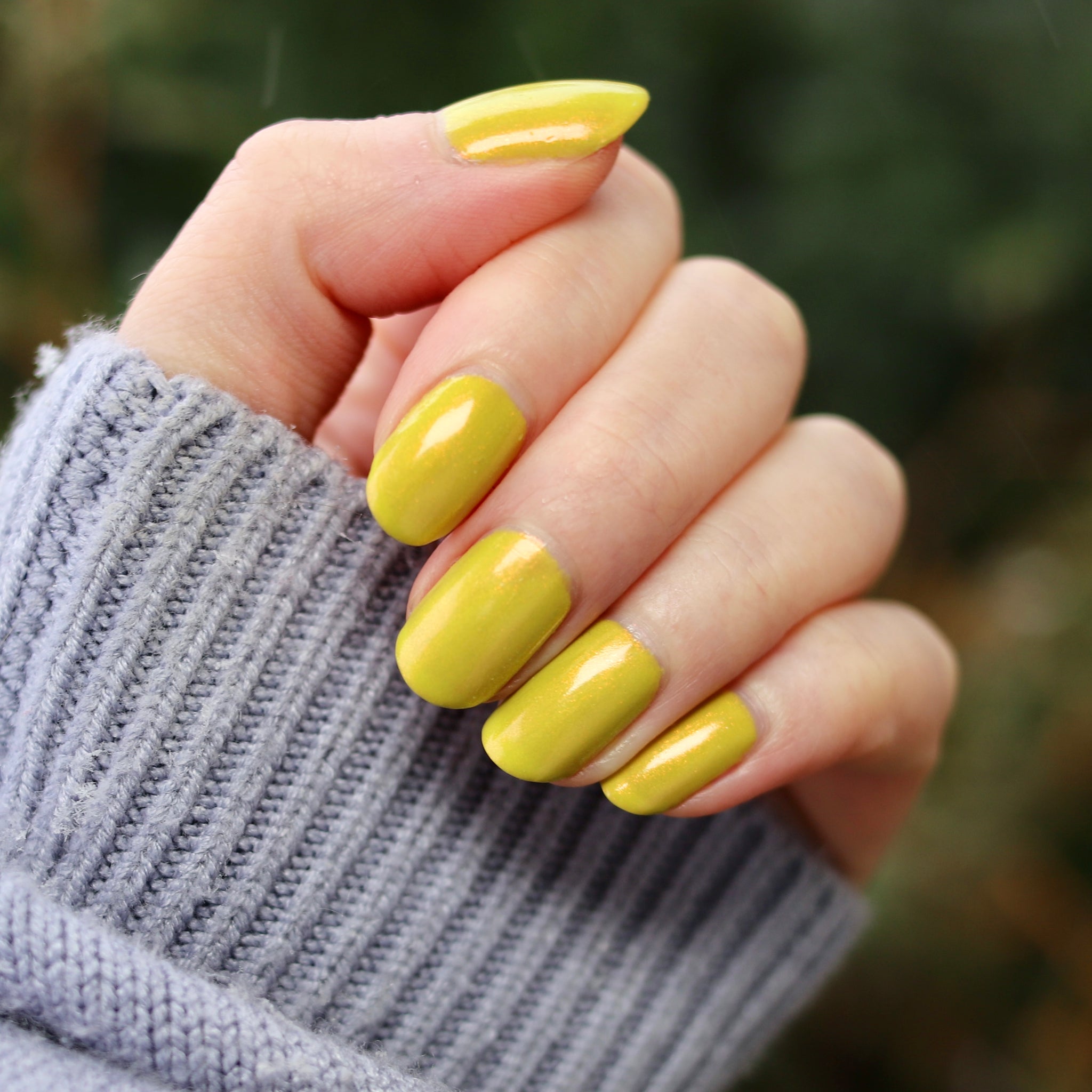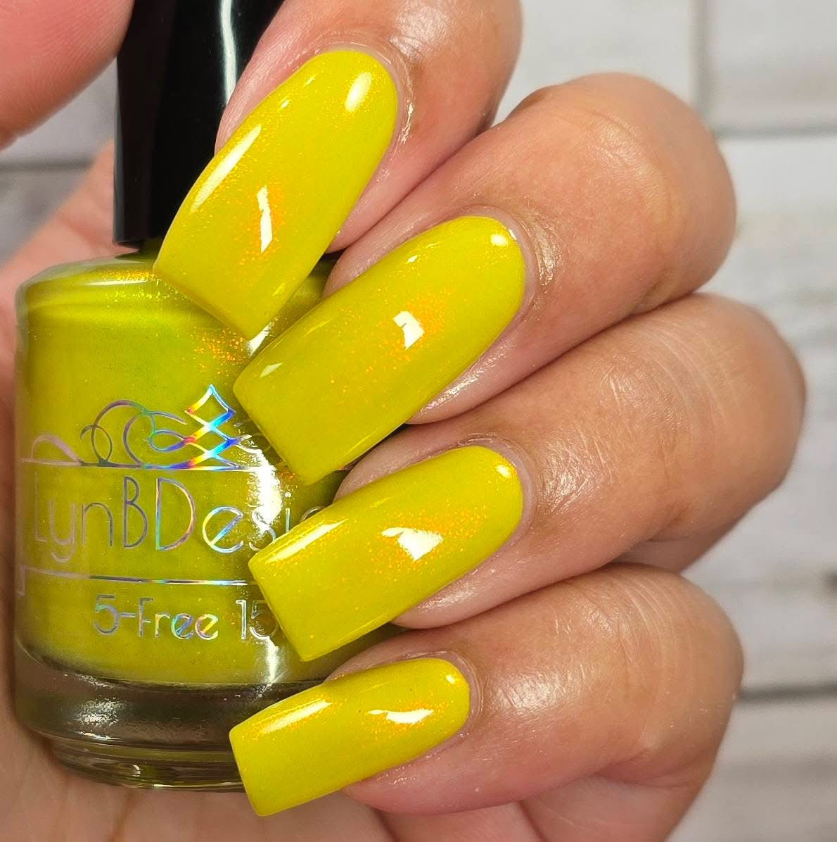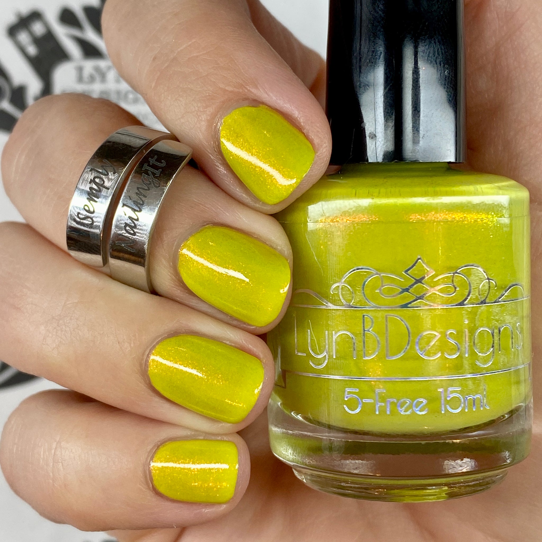My Boo- light chartreuse base with red to orange to gold shifting shimmer